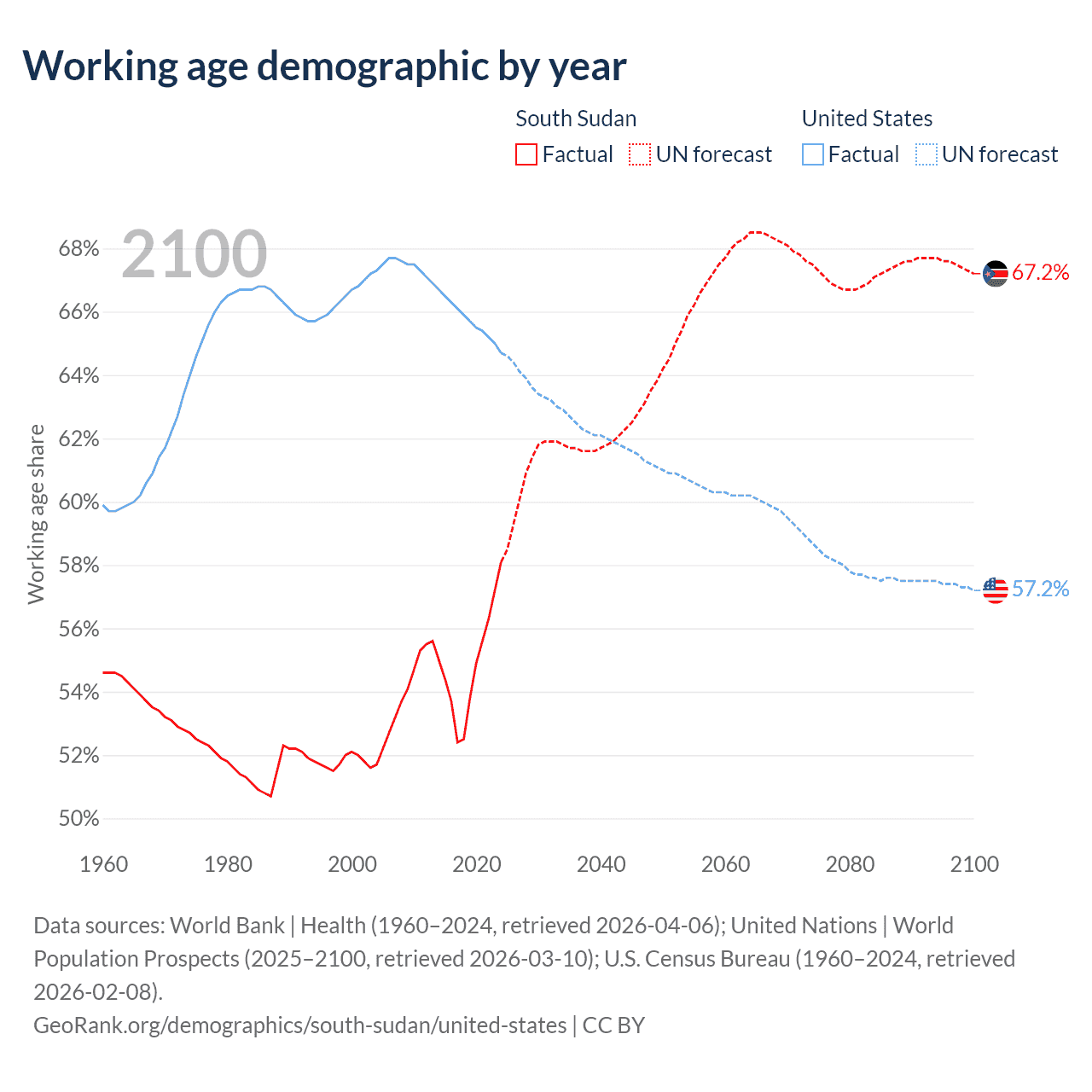 - South Sudan has 7.27M working age adults (aged 15-64) vs 223M in the United States.