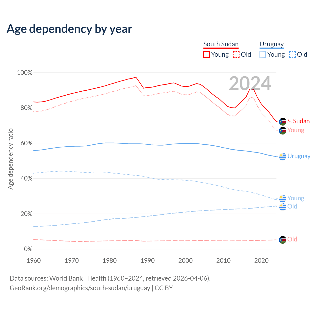- South Sudan is ranked 173/196 by median age (oldest to youngest) vs 63/196 for Uruguay.