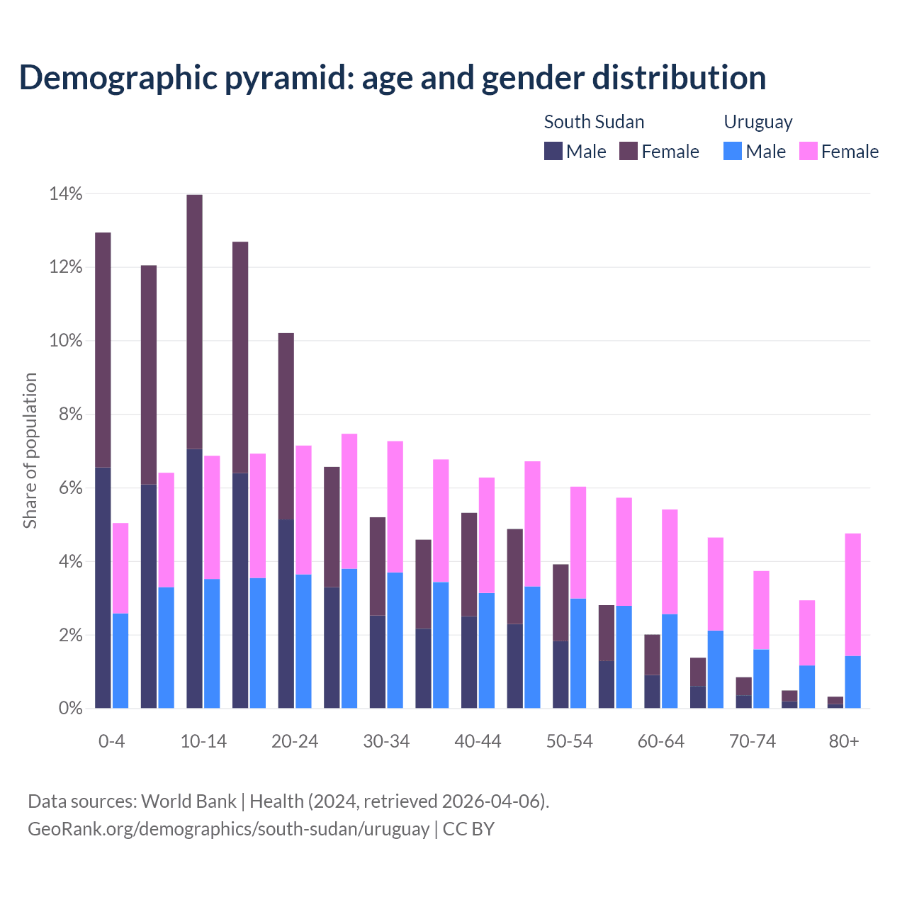 - As of 2026, the population of South Sudan is 12.5M vs 3.38M in Uruguay - 3.7 times difference.