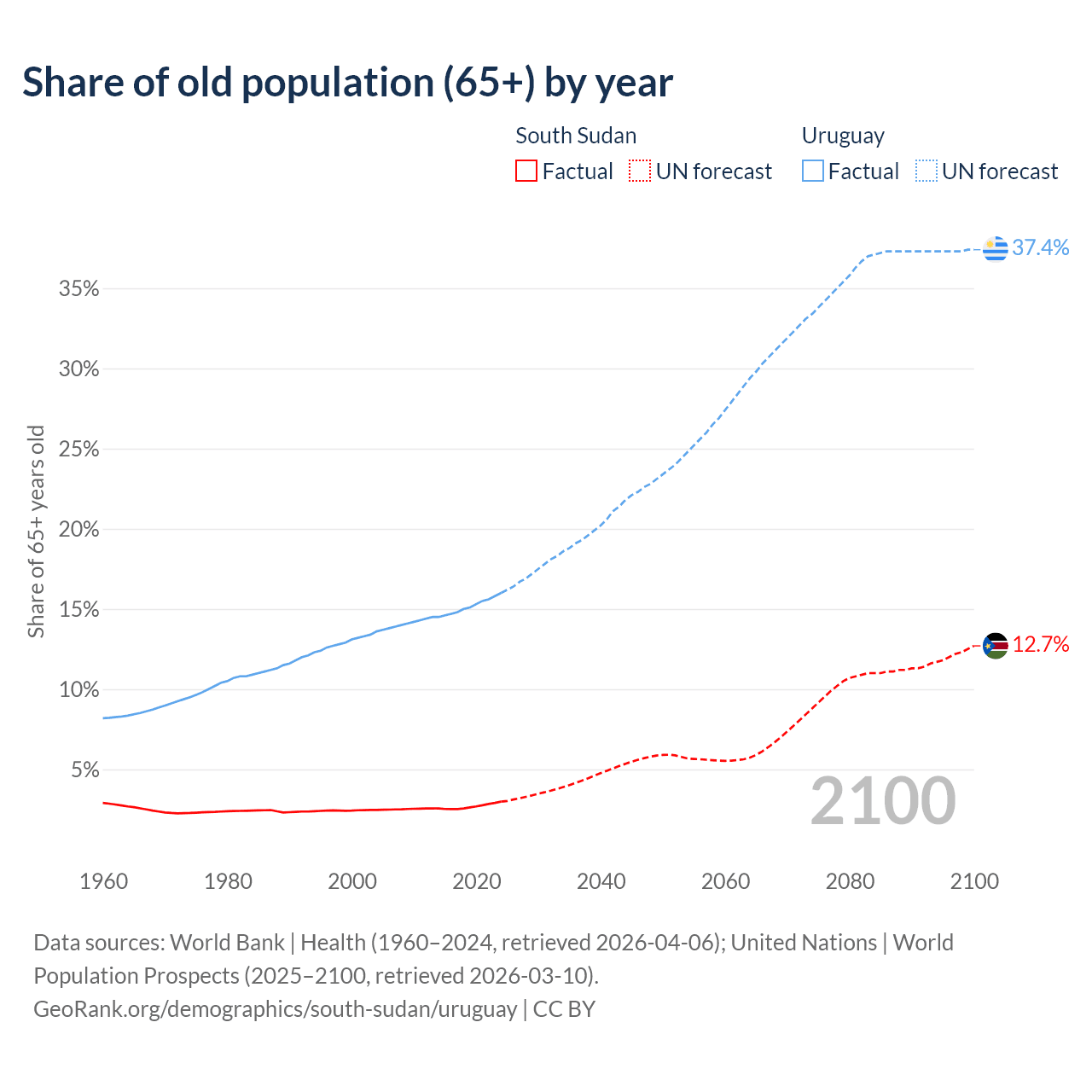 The share of older people aged 65 and over is 2.99% in South Sudan and 16% in Uruguay. Life expectancy in South Sudan compared to Uruguay .