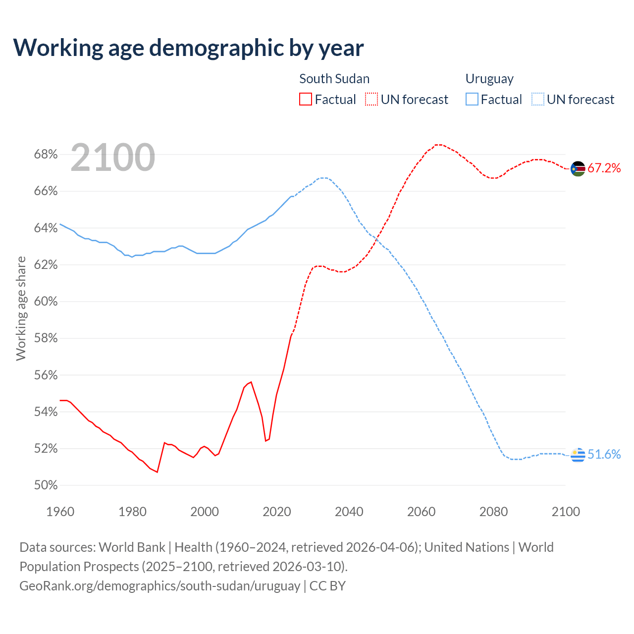 - South Sudan has 7.27M working age adults (aged 15-64) vs 2.22M in Uruguay.