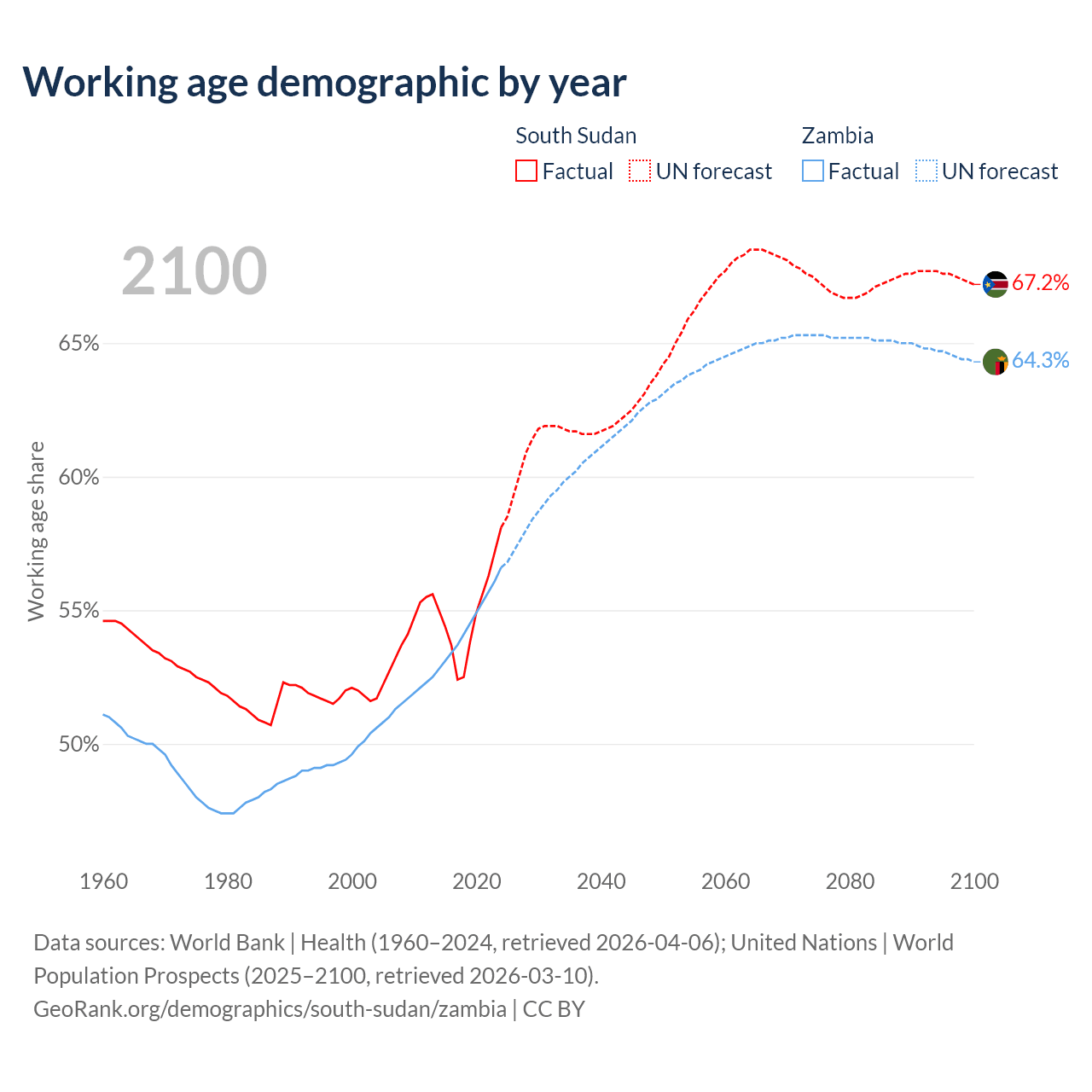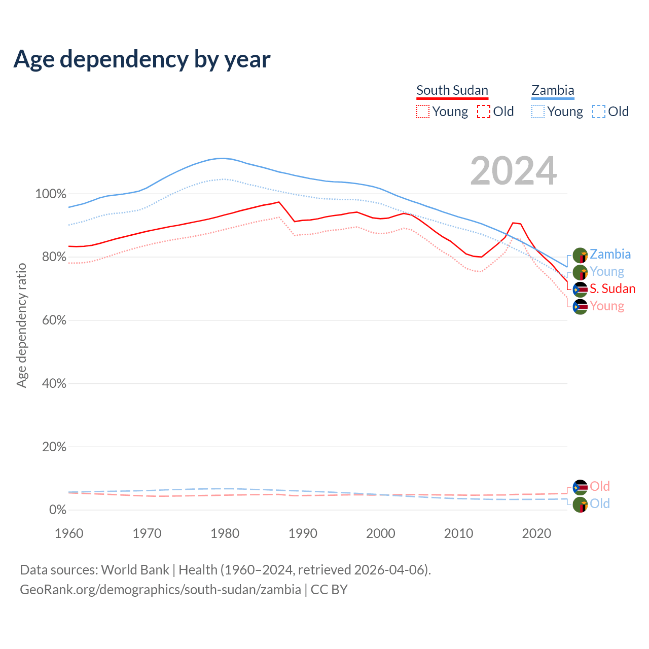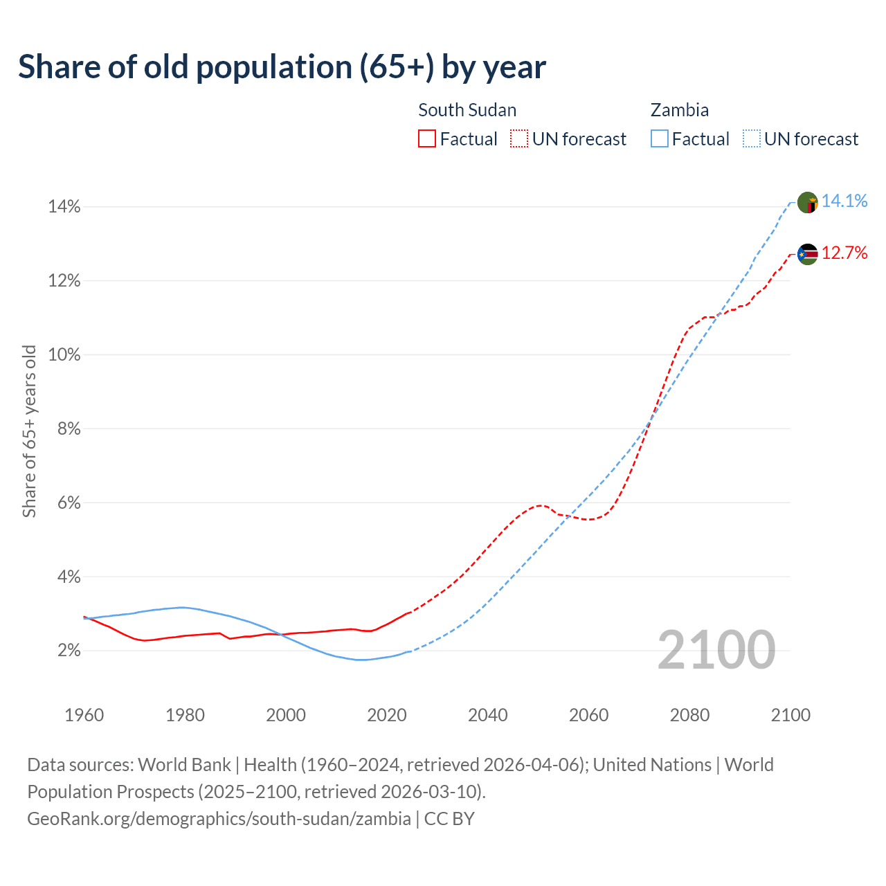 The share of older people aged 65 and over is 2.99% in South Sudan and 1.95% in Zambia. Life expectancy in South Sudan compared to Zambia .