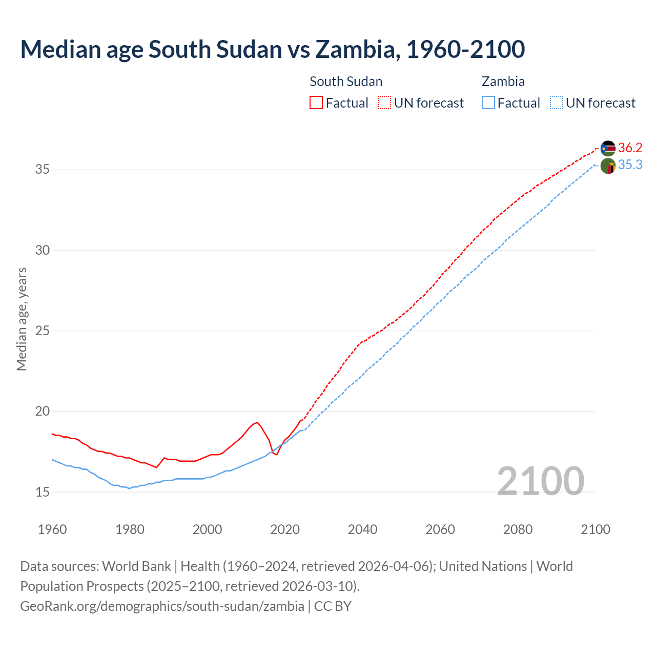 Median age South Sudan vs Zambia, 1960-2100