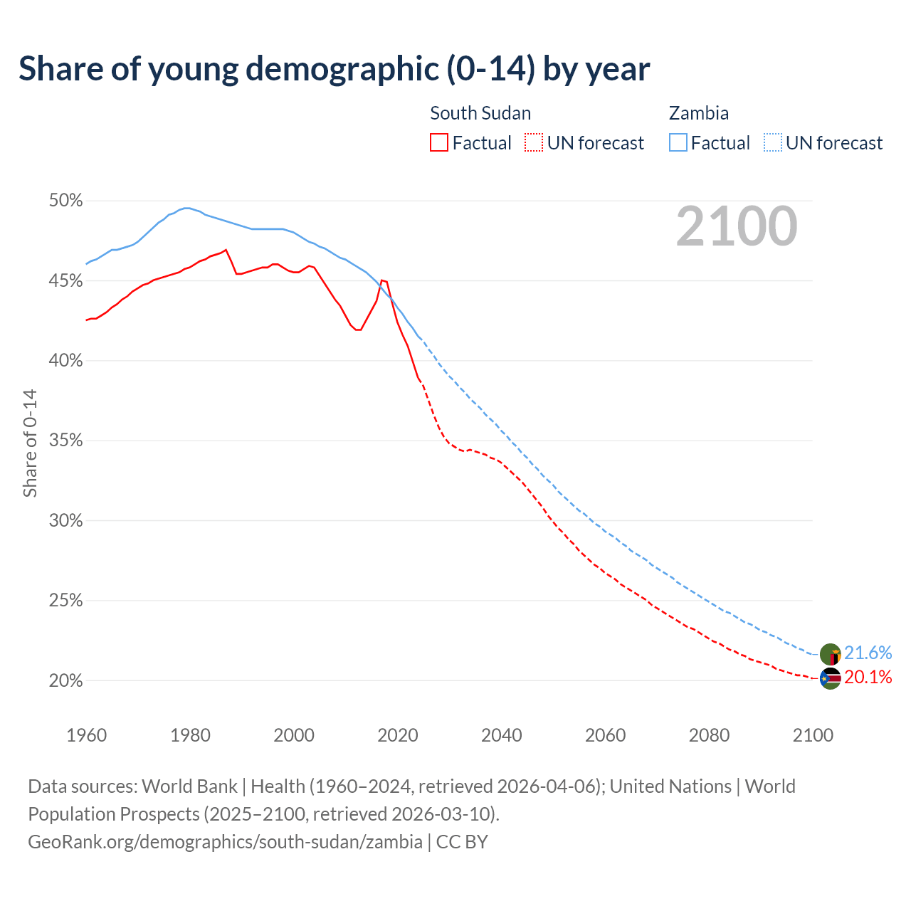 - The share of young demographic (0-15 years old) in South Sudan is 38.9% vs 41.5% in Zambia.