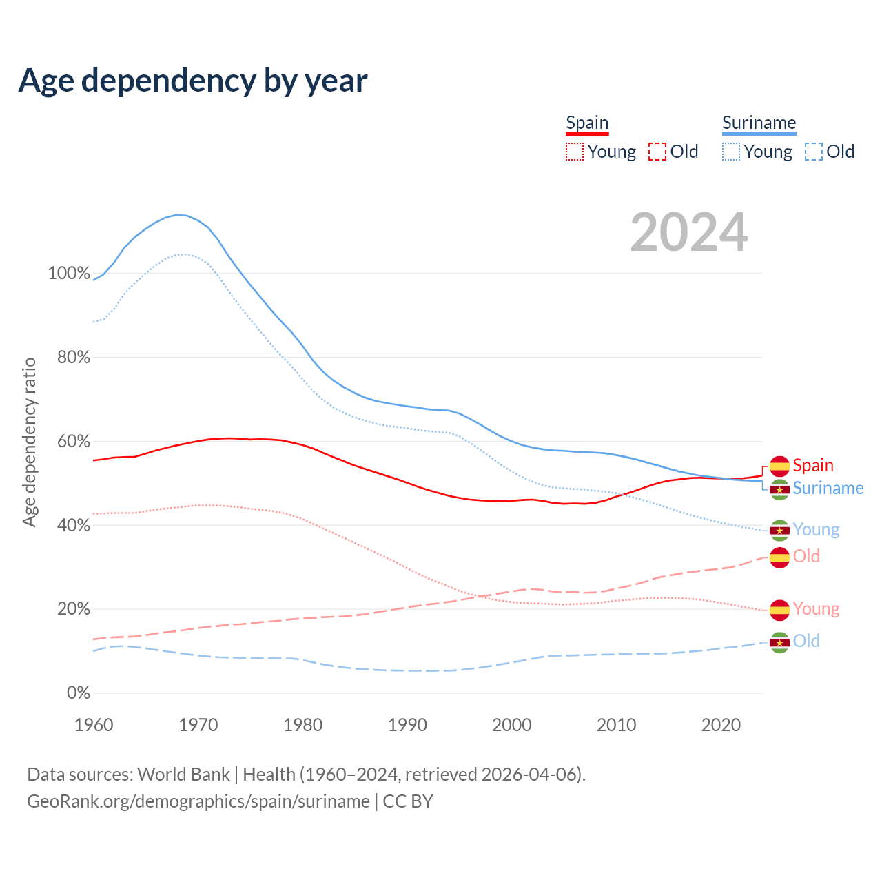 - Spain is ranked 7/196 by median age (oldest to youngest) vs 109/196 for Suriname.