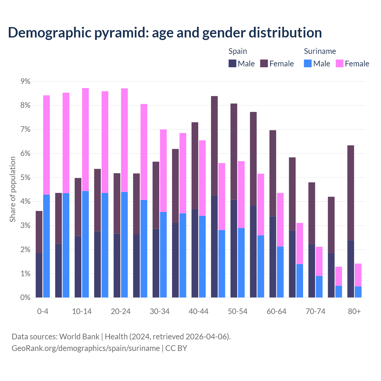 - The share of old-age demographic (65+) in Spain is 21.1% vs 7.9% in Suriname.