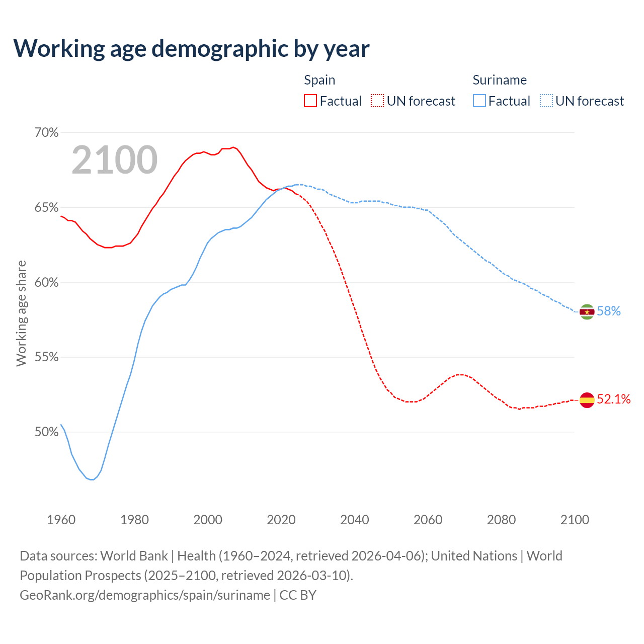 Median age Spain vs Suriname, 1960-2100