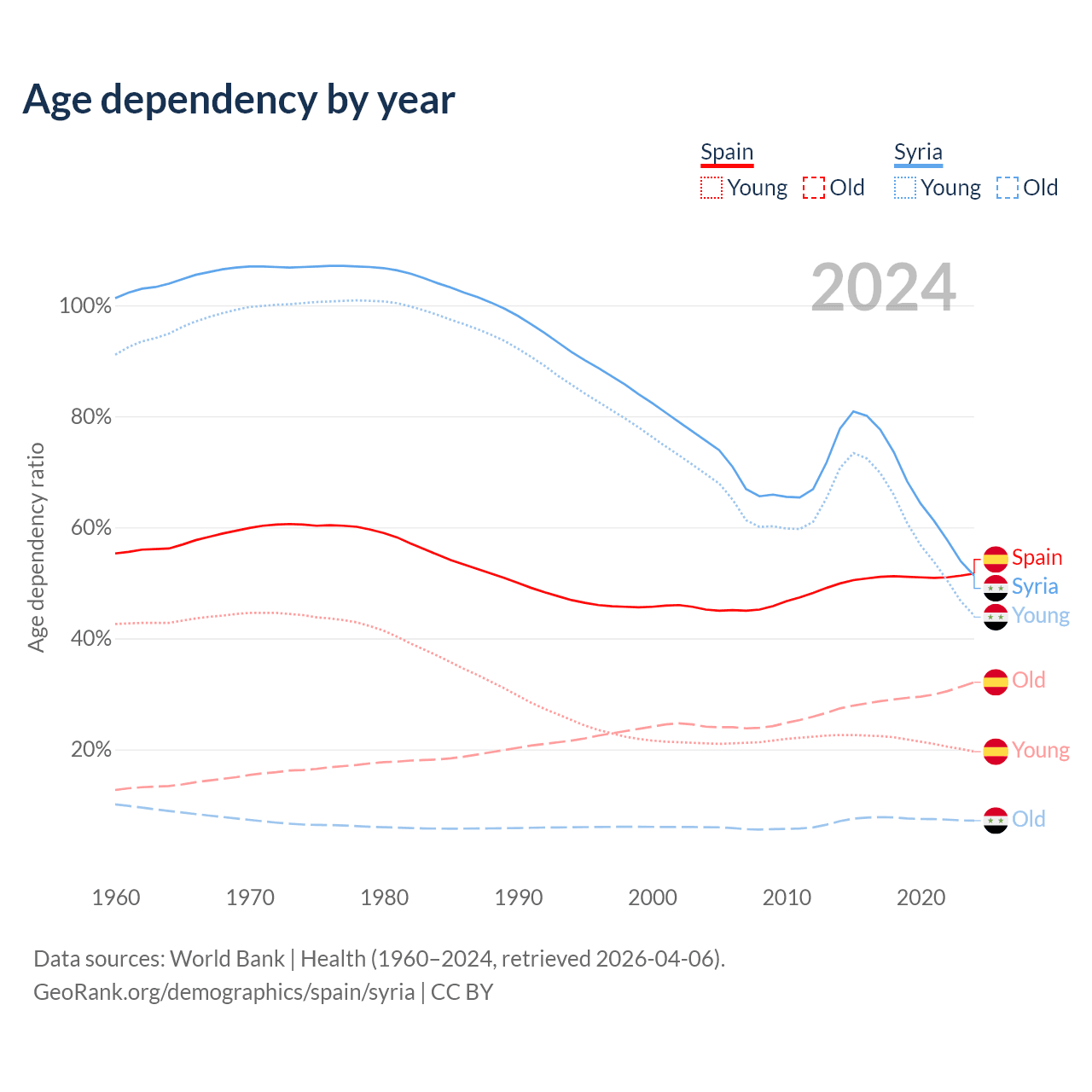 - The share of old-age demographic (65+) in Spain is 21.1% vs 4.74% in Syria.