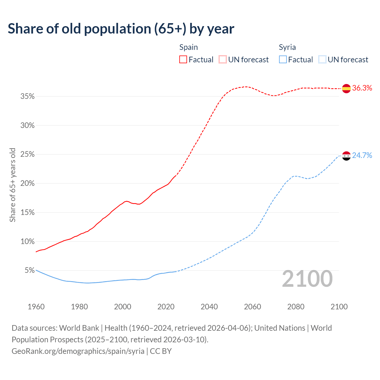 The share of older people aged 65 and over is 21.1% in Spain and 4.74% in Syria. Life expectancy in Spain compared to Syria .