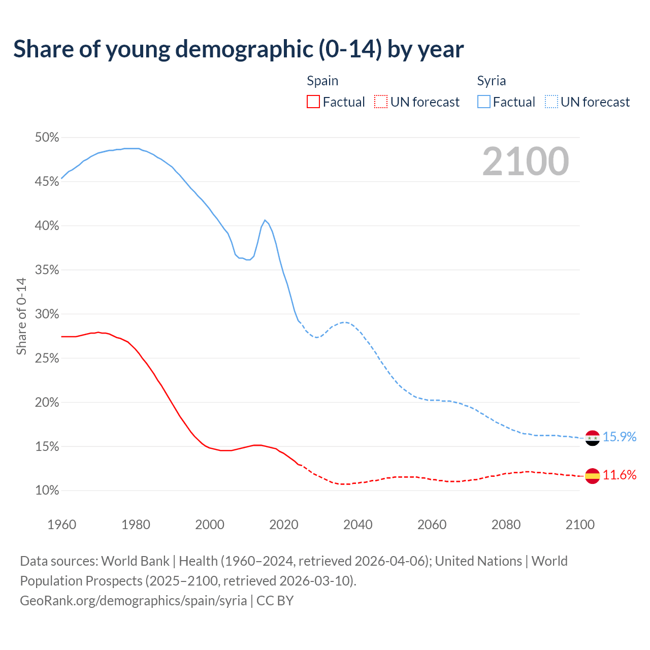 - The share of young demographic (0-15 years old) in Spain is 12.9% vs 29.2% in Syria.