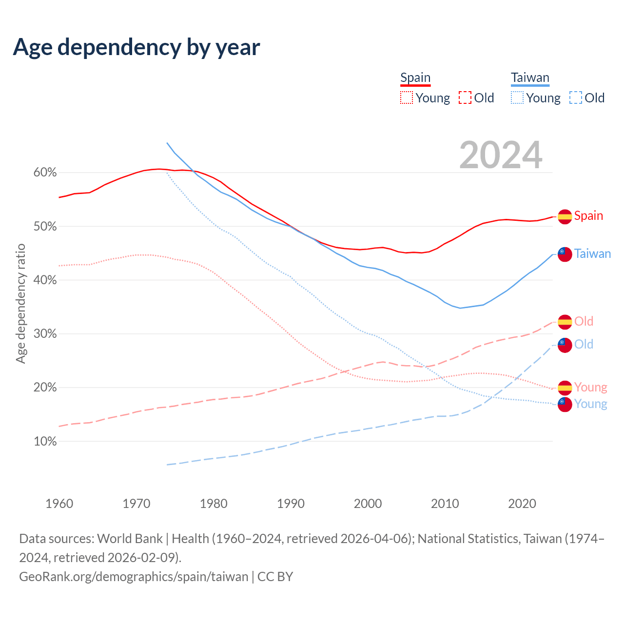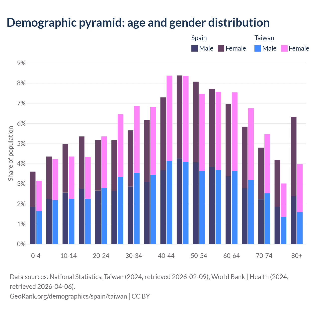 - Spain is ranked 7/196 by median age (oldest to youngest) vs 16/196 for Taiwan.