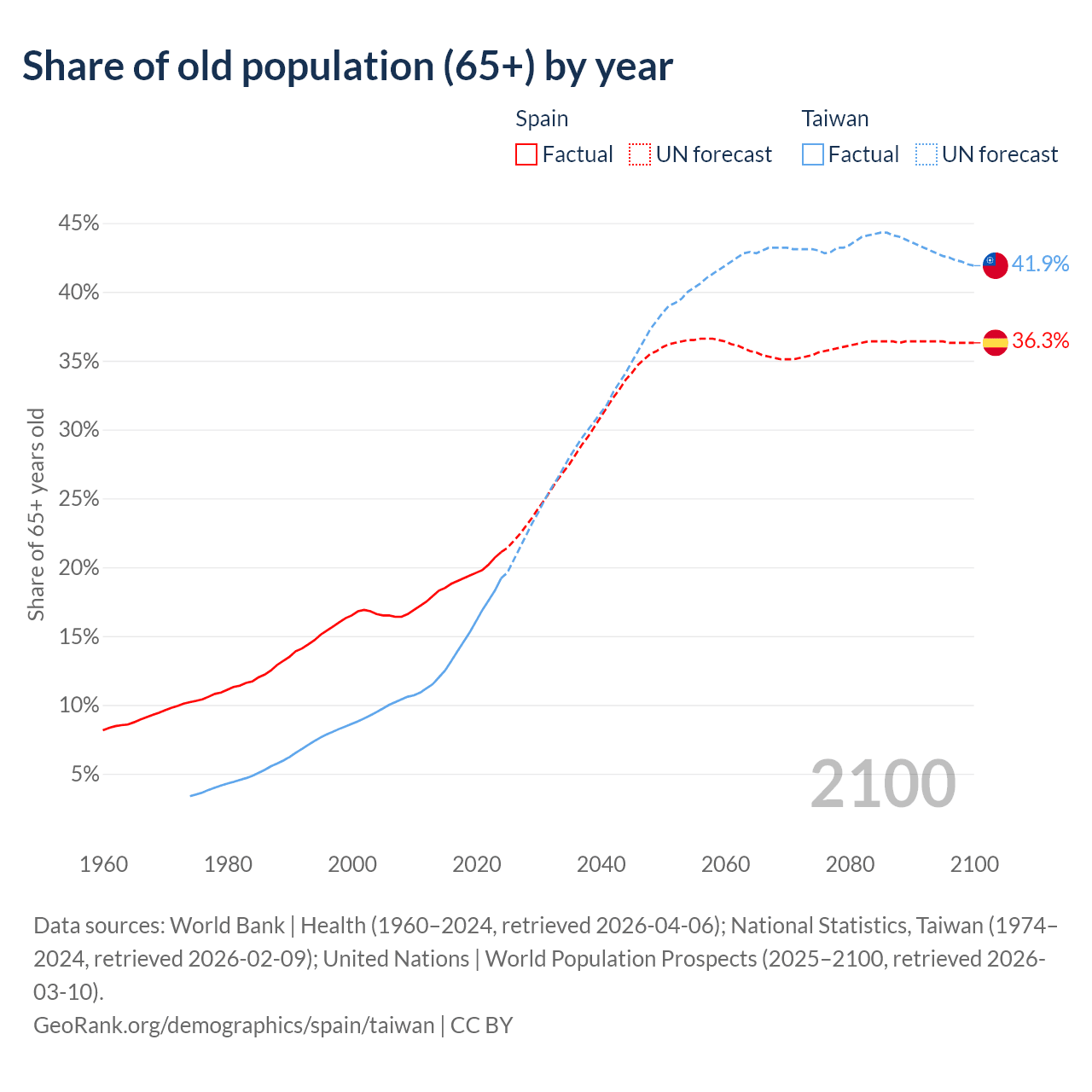 The share of older people aged 65 and over is 21.1% in Spain and 19.2% in Taiwan. Life expectancy in Spain compared to Taiwan .