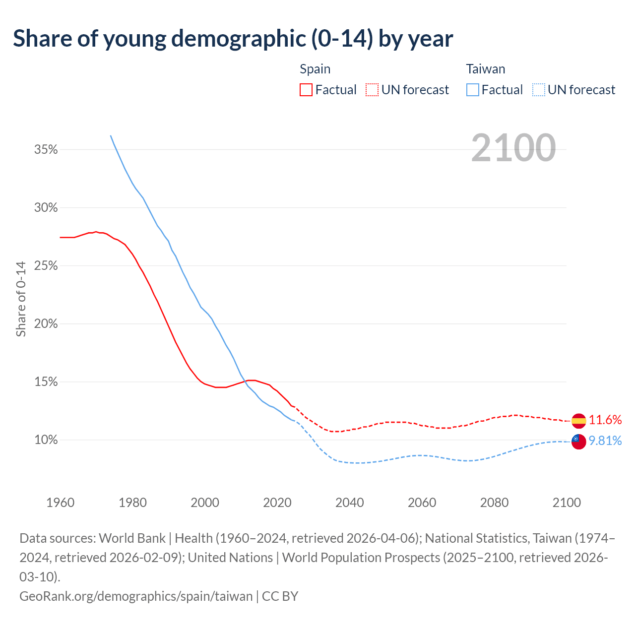 - The share of young demographic (0-15 years old) in Spain is 12.9% vs 11.7% in Taiwan.