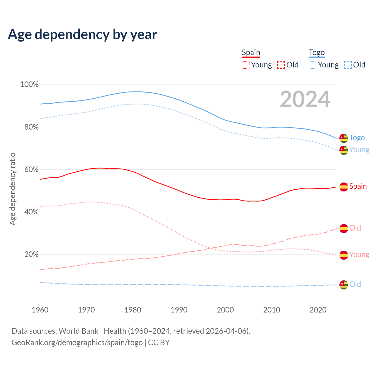- Spain is ranked 7/196 by median age (oldest to youngest) vs 166/196 for Togo.