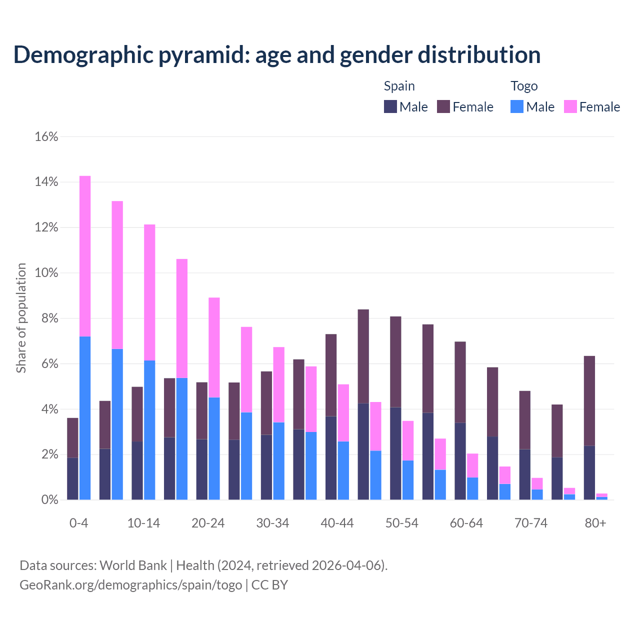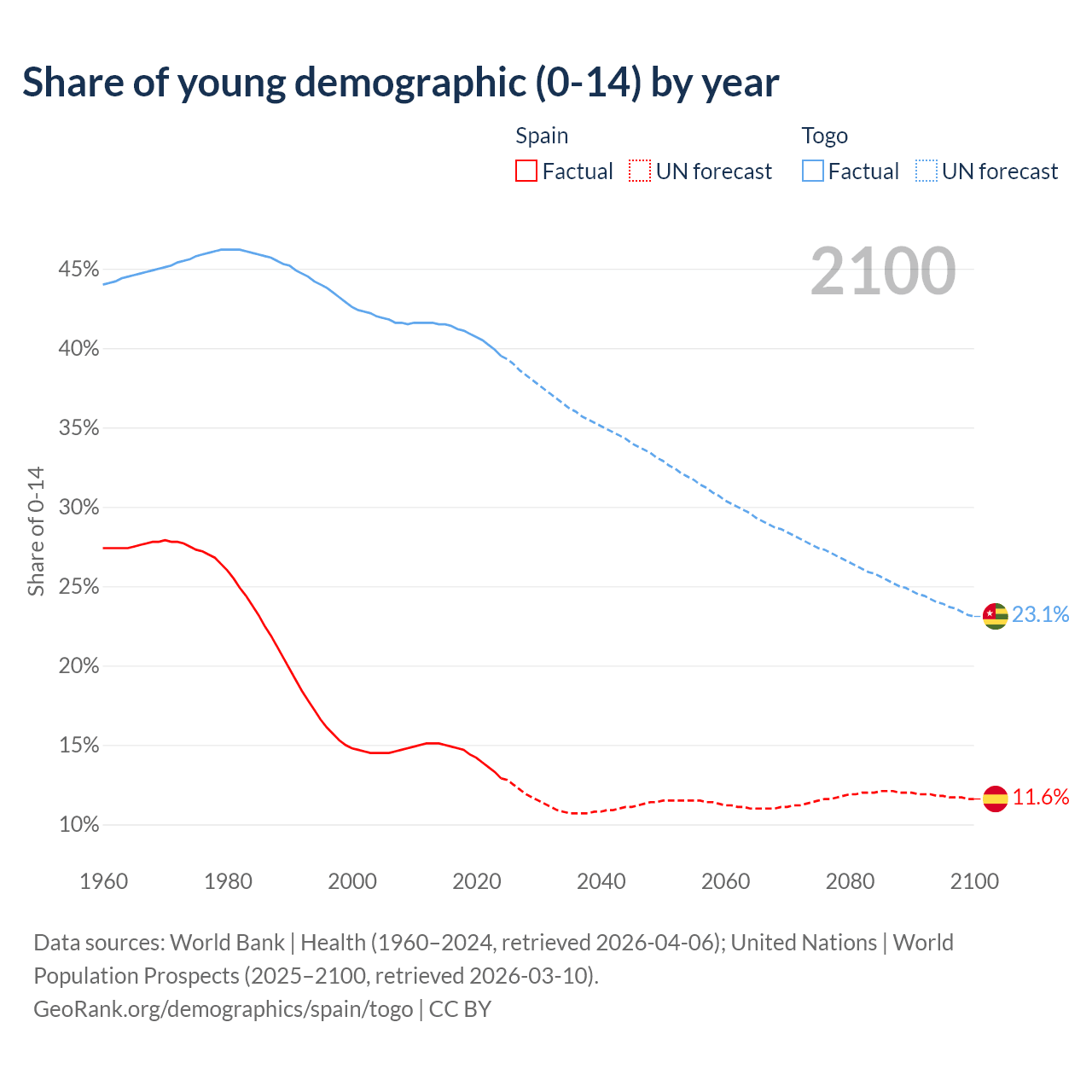 - The share of young demographic (0-15 years old) in Spain is 12.9% vs 39.5% in Togo.