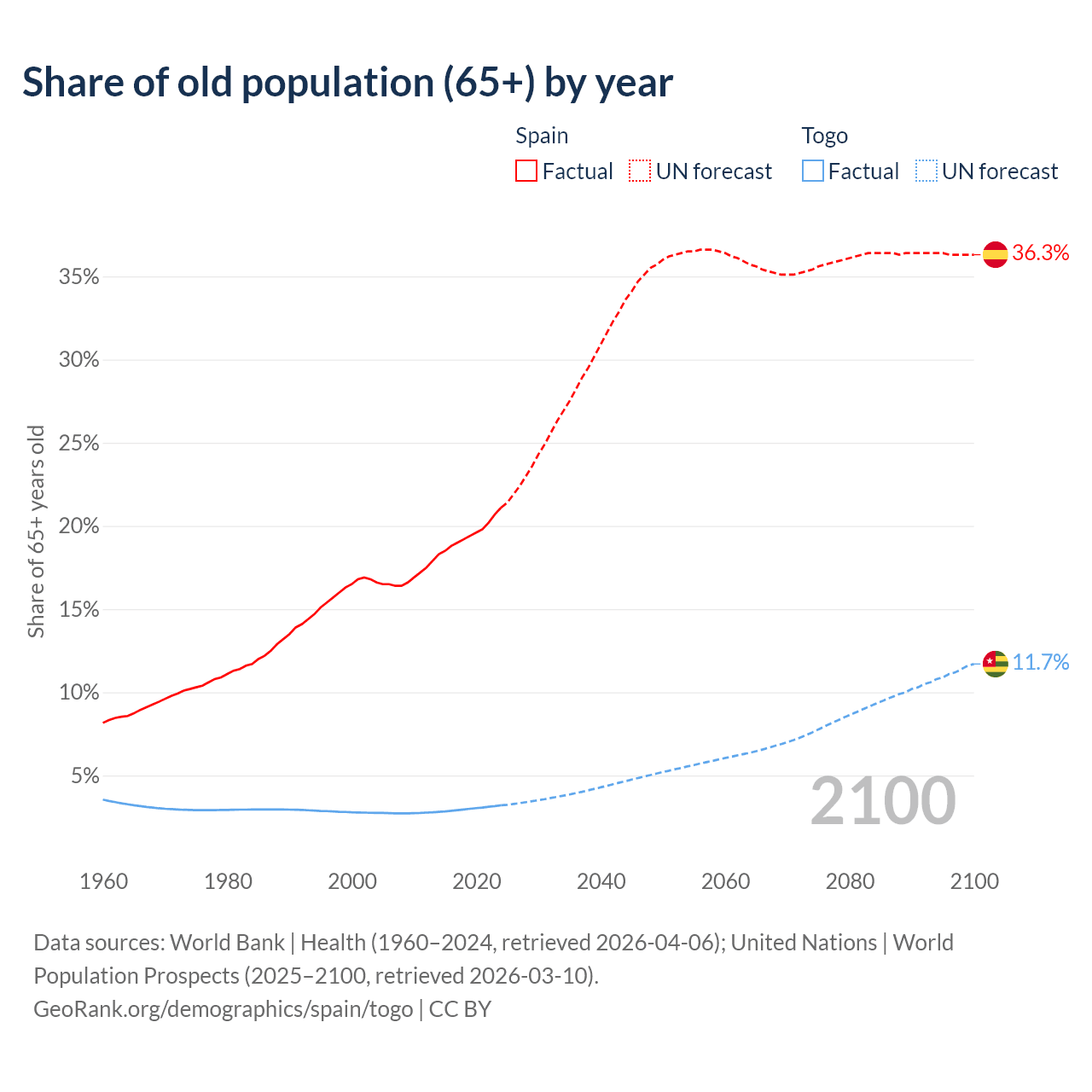 The share of older people aged 65 and over is 21.1% in Spain and 3.21% in Togo. Life expectancy in Spain compared to Togo .
