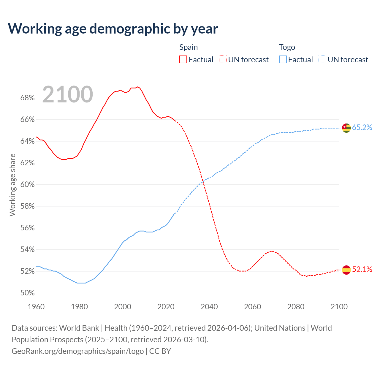 - Spain has 32.2M working age adults (aged 15-64) vs 5.72M in Togo.