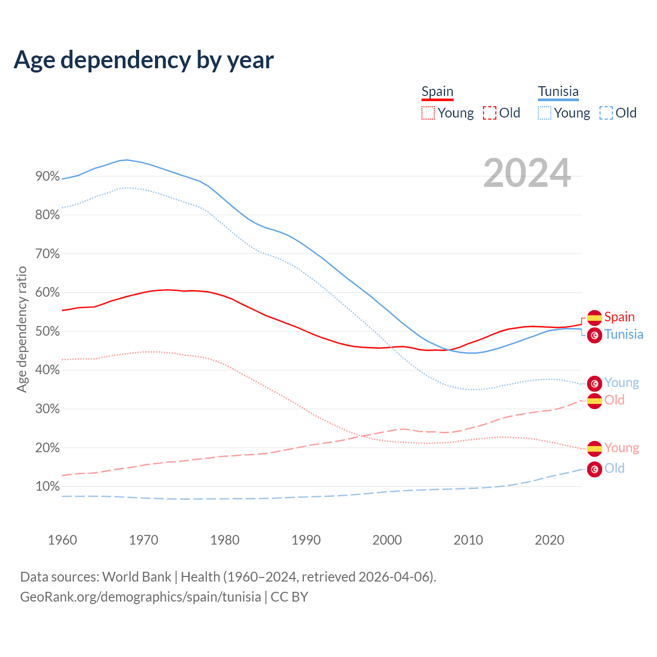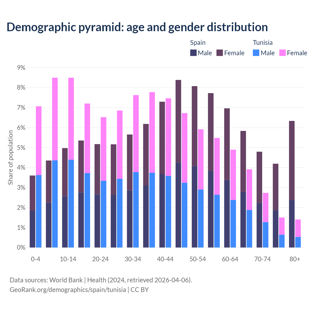 - Spain is ranked 7/196 by median age (oldest to youngest) vs 86/196 for Tunisia.