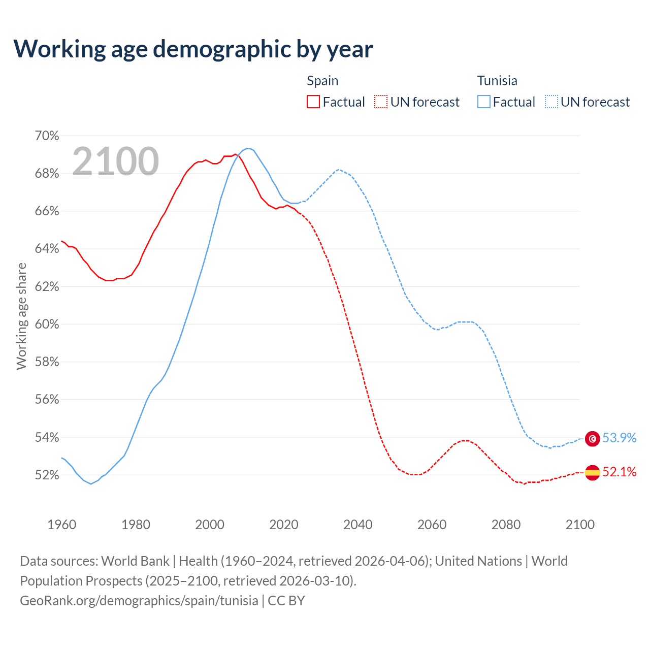 - Spain has 32.2M working age adults (aged 15-64) vs 8.26M in Tunisia.