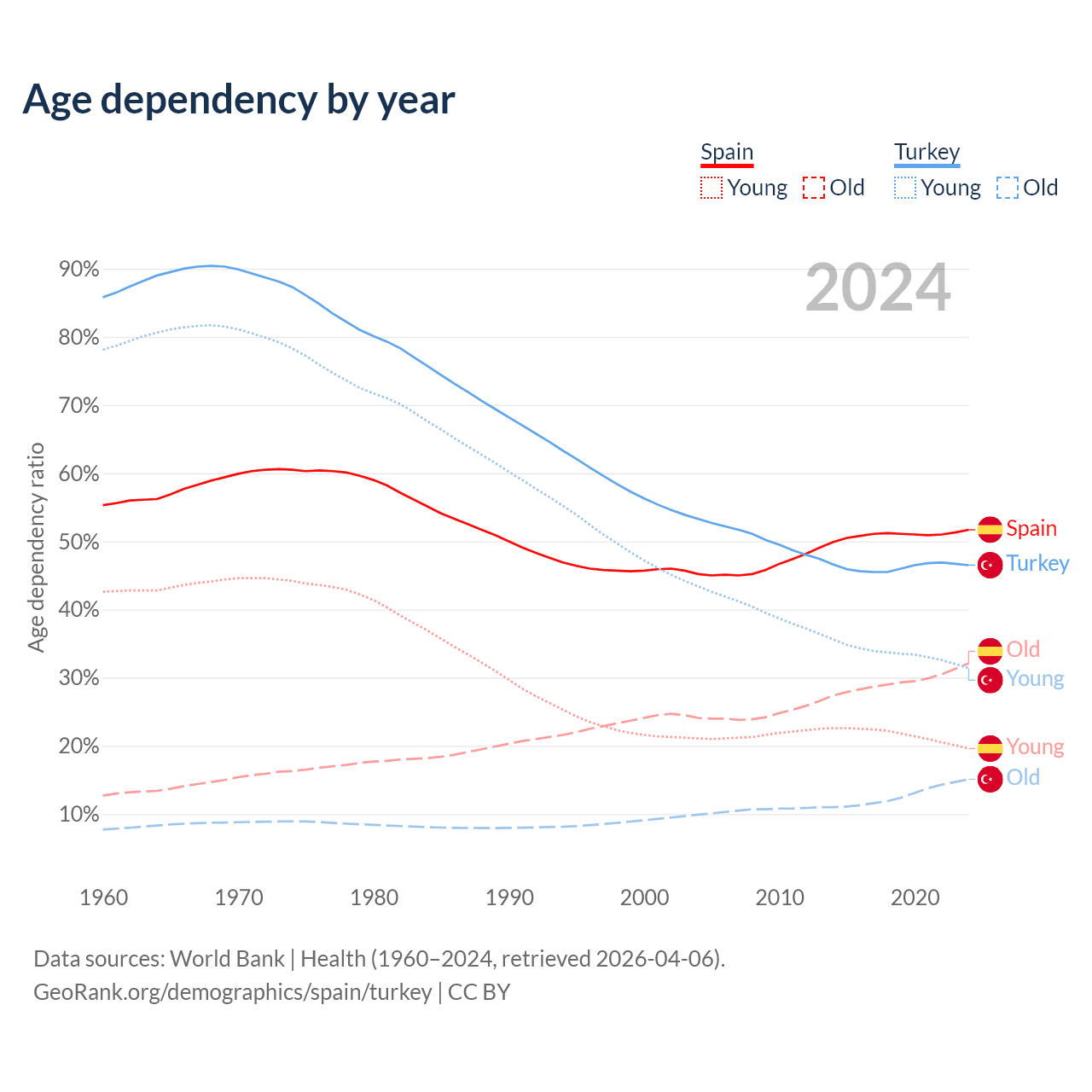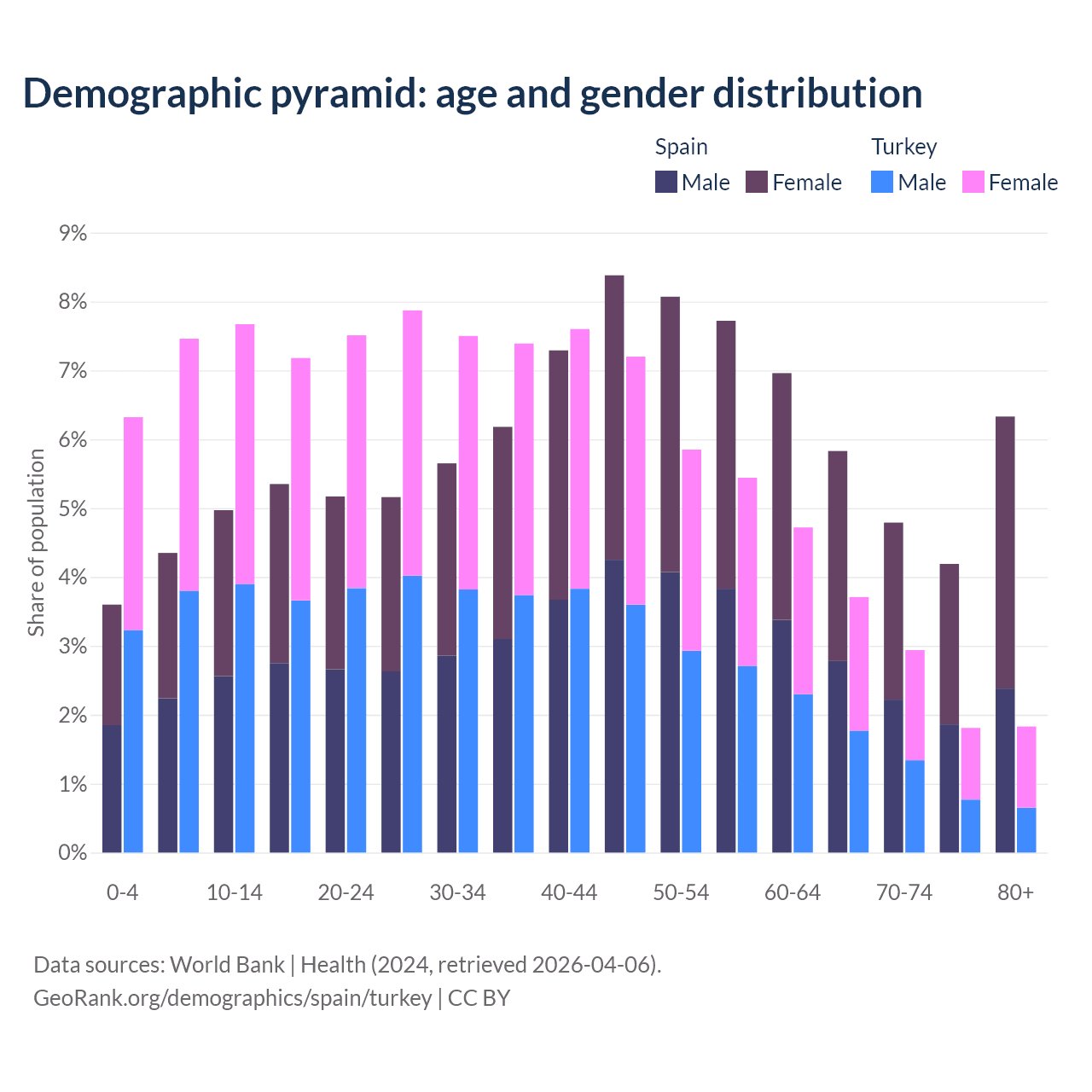 - Spain is ranked 7/196 by median age (oldest to youngest) vs 83/196 for Turkey.