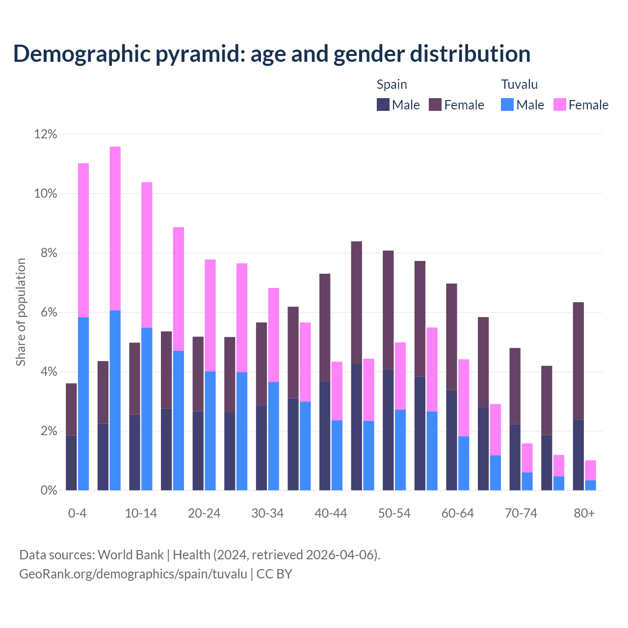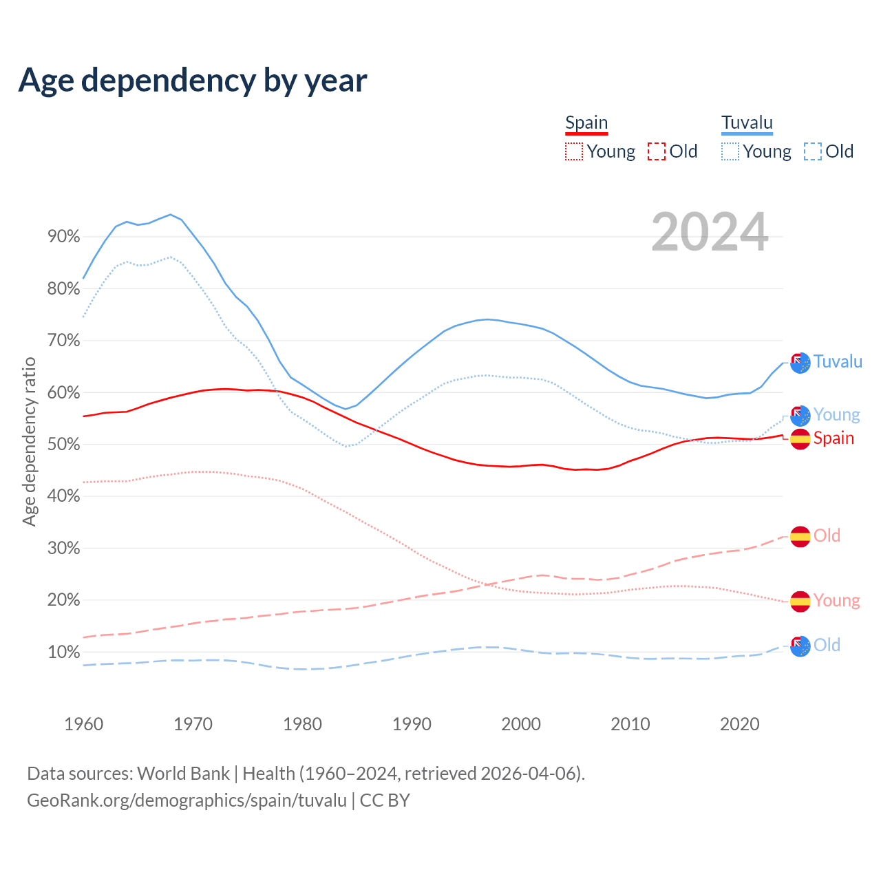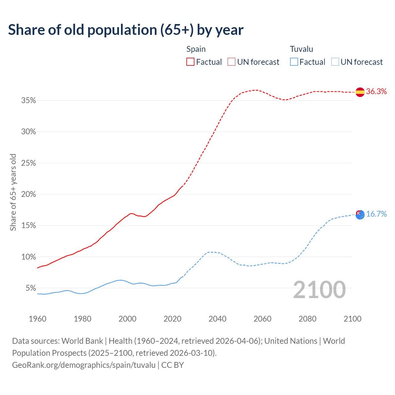 - The share of old-age demographic (65+) in Spain is 21.1% vs 6.67% in Tuvalu.