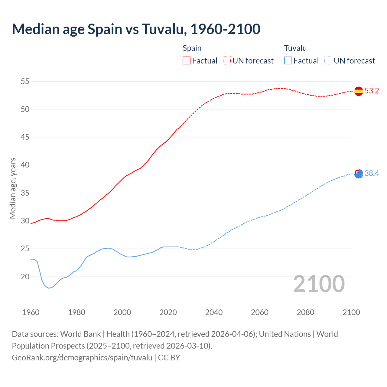 Median age Spain vs Tuvalu, 1960-2100