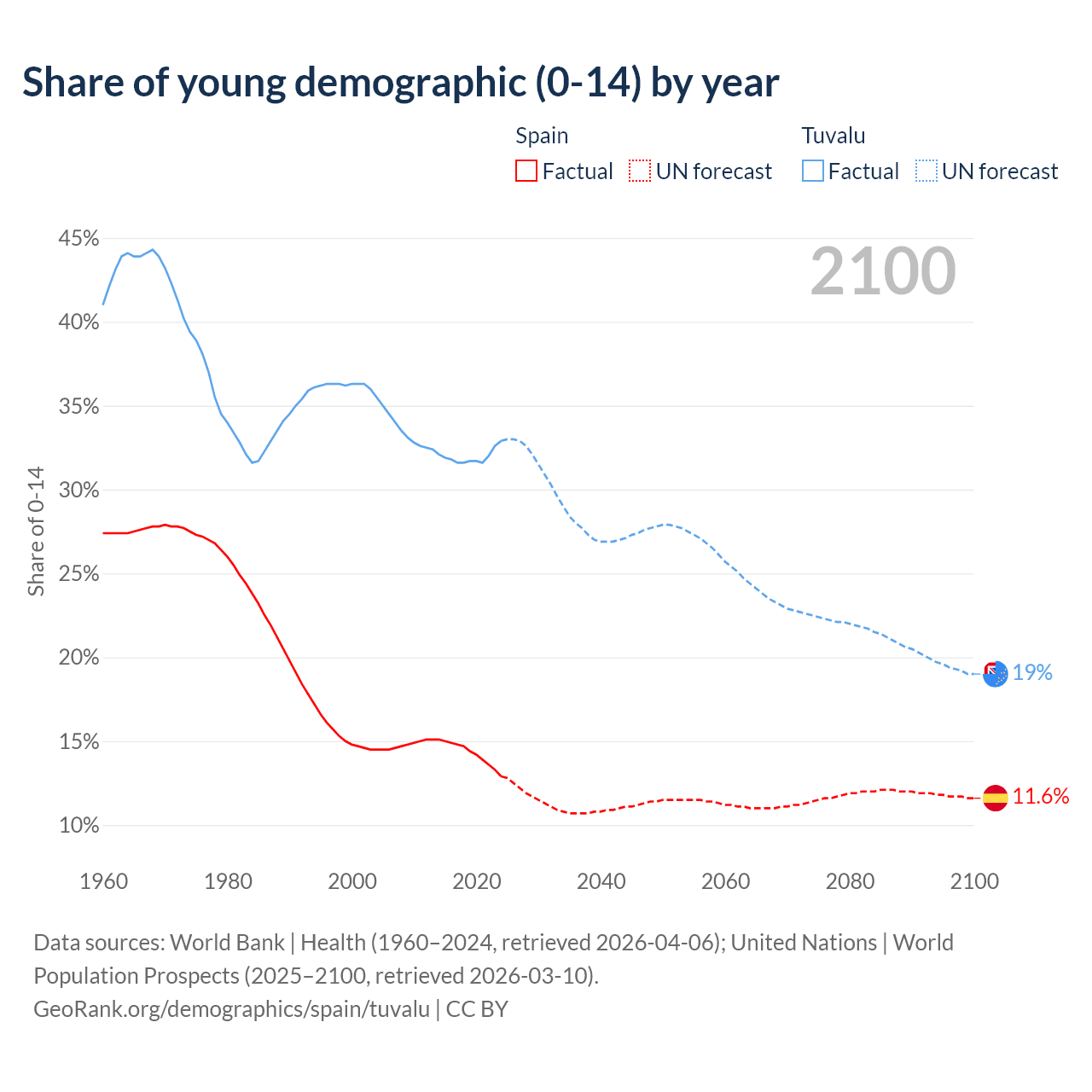 - The share of young demographic (0-15 years old) in Spain is 12.9% vs 32.9% in Tuvalu.
