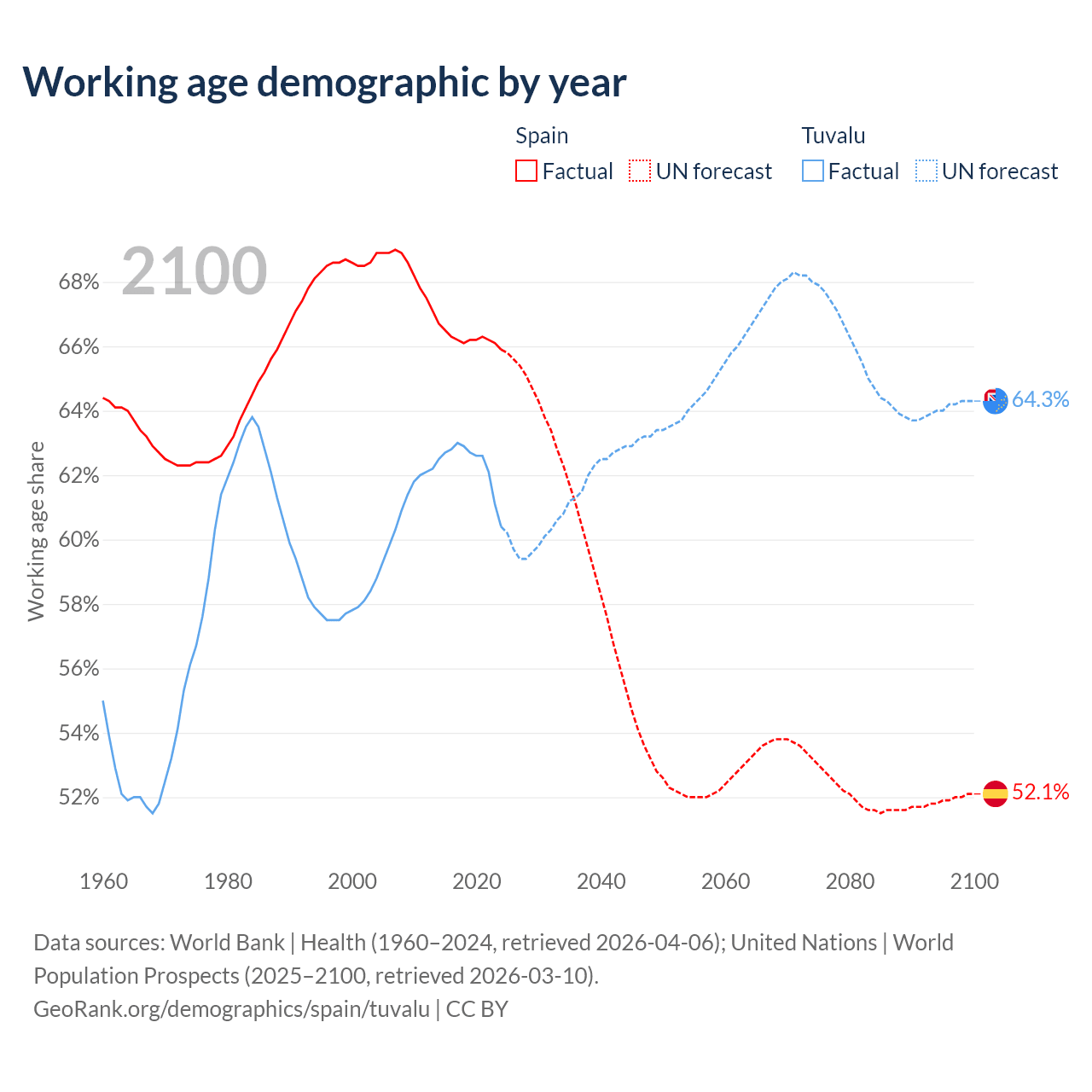 - Spain has 32.2M working age adults (aged 15-64) vs 5.64K in Tuvalu.