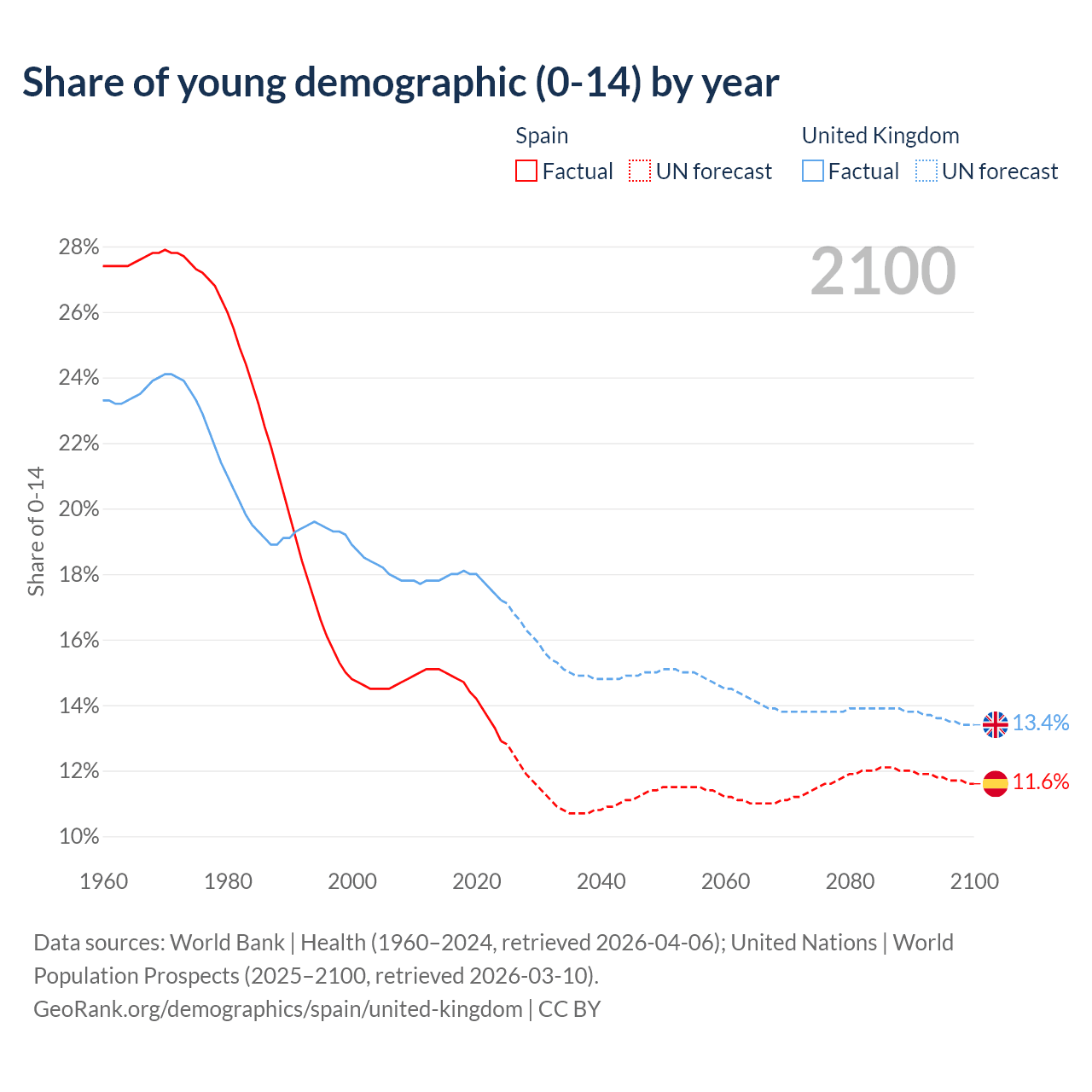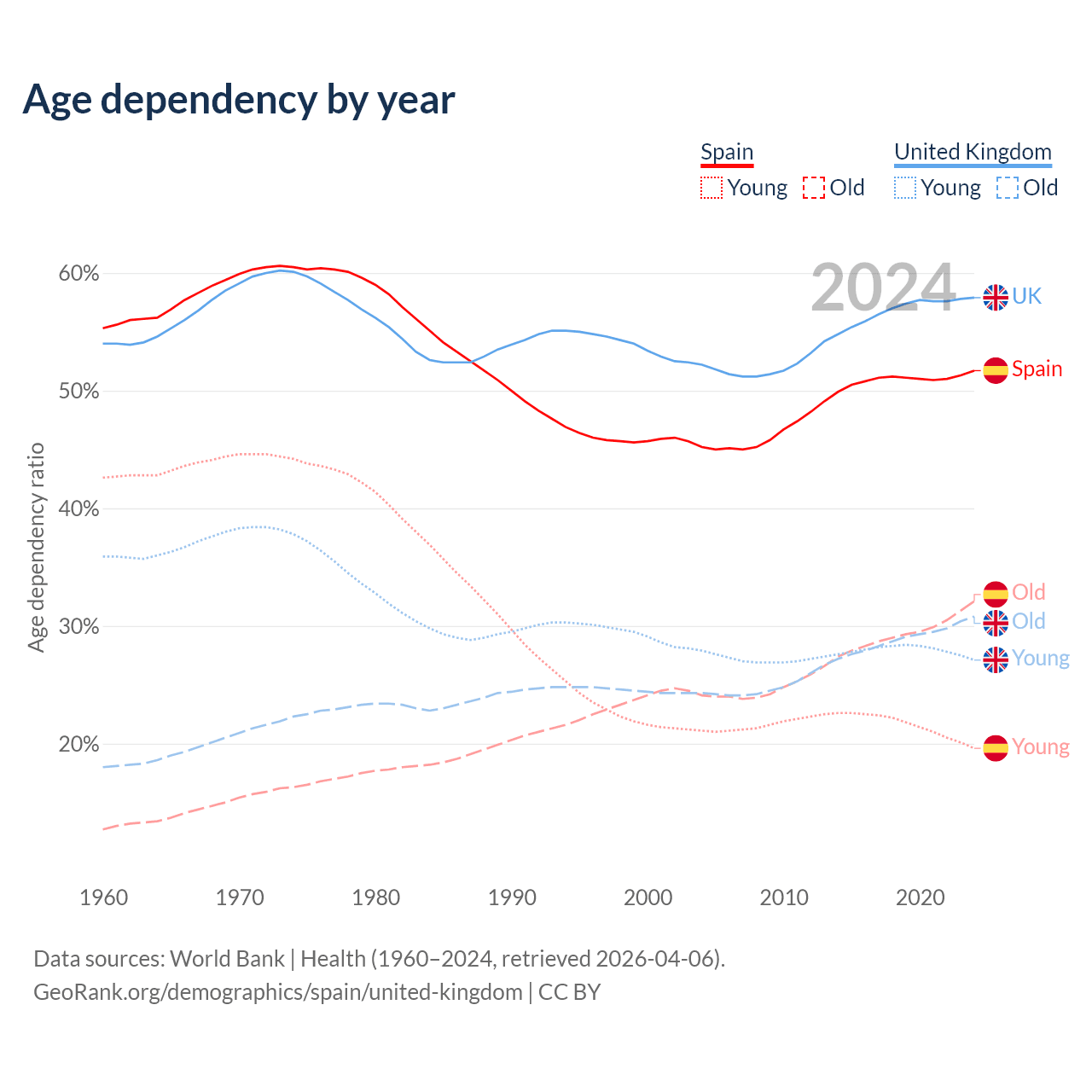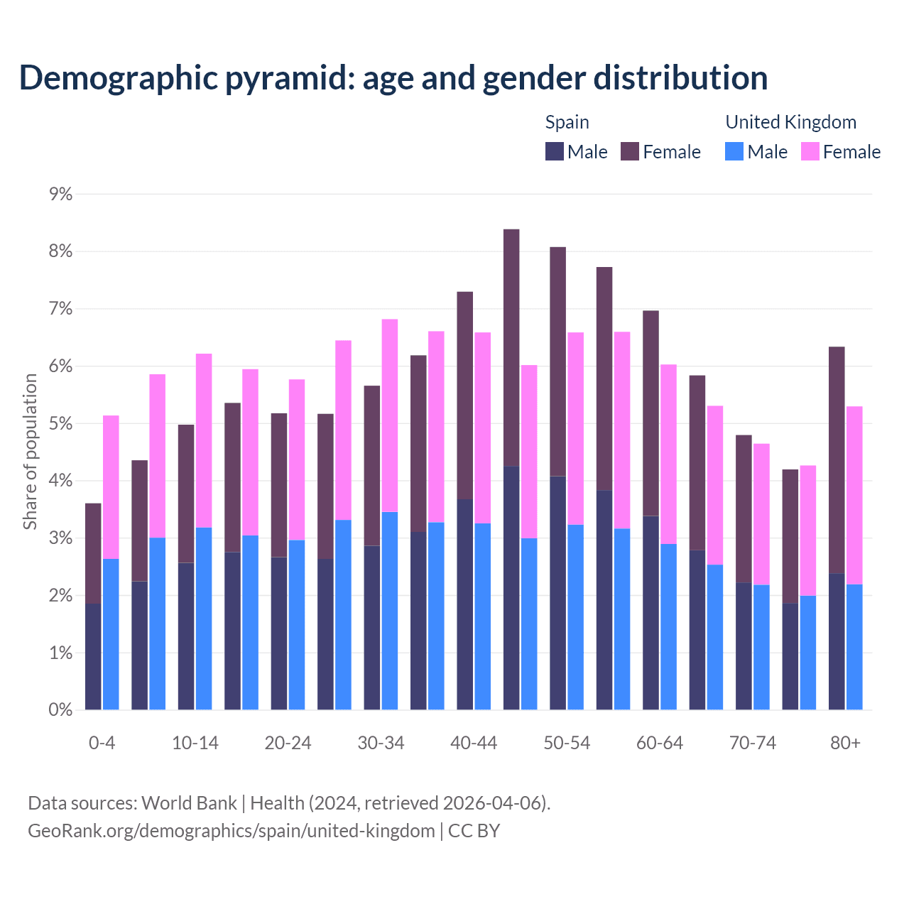 - Spain is ranked 7/196 by median age (oldest to youngest) vs 41/196 for the United Kingdom.