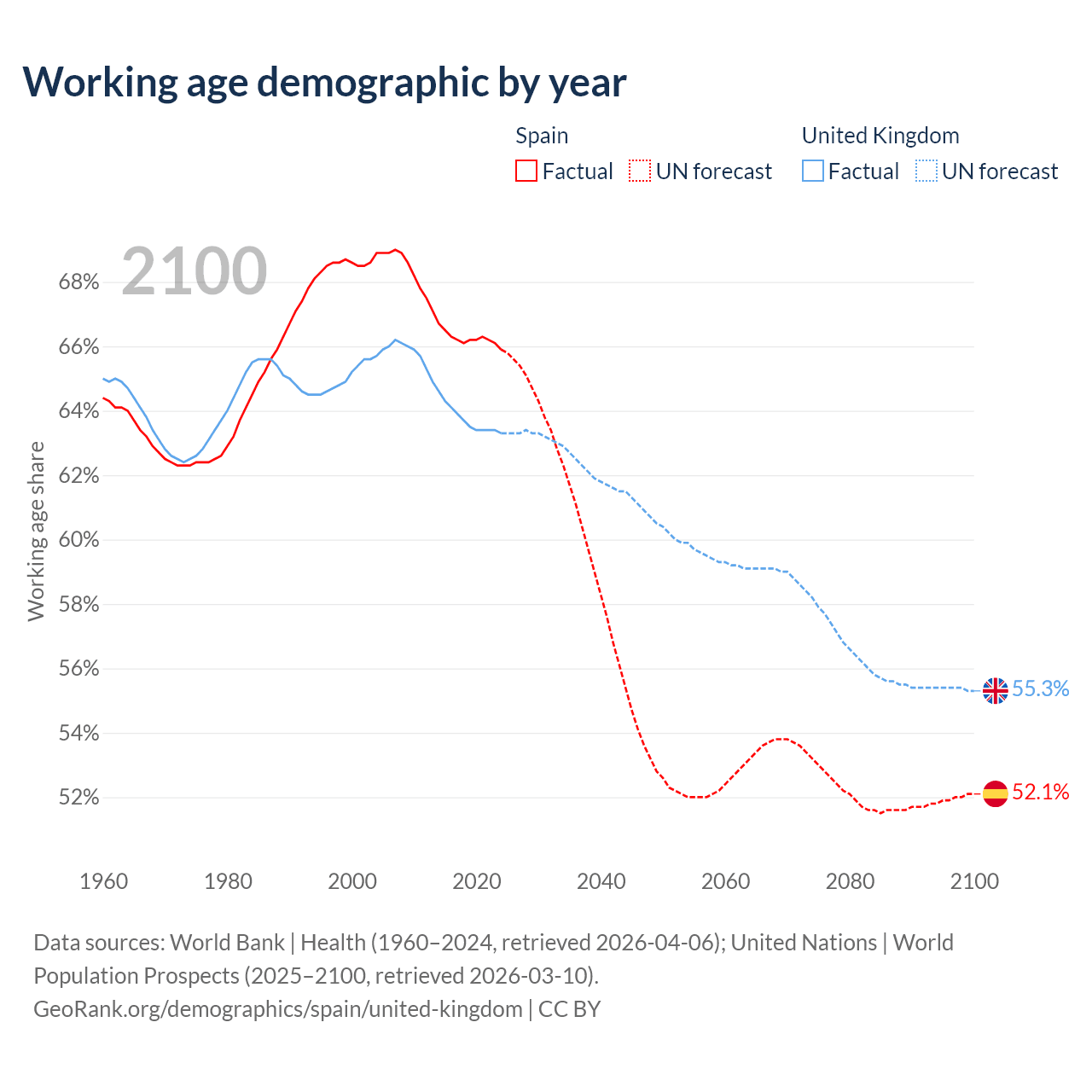 - Spain has 32.2M working age adults (aged 15-64) vs 44.4M in the United Kingdom.