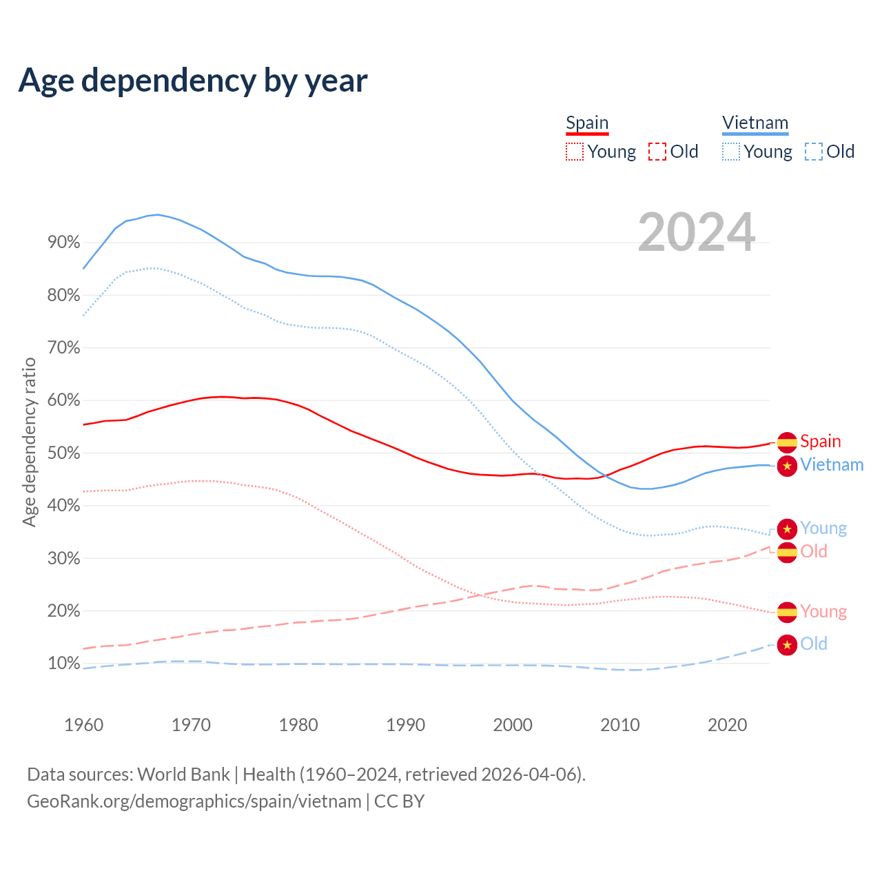 - Spain is ranked 7/196 by median age (oldest to youngest) vs 84/196 for Vietnam.