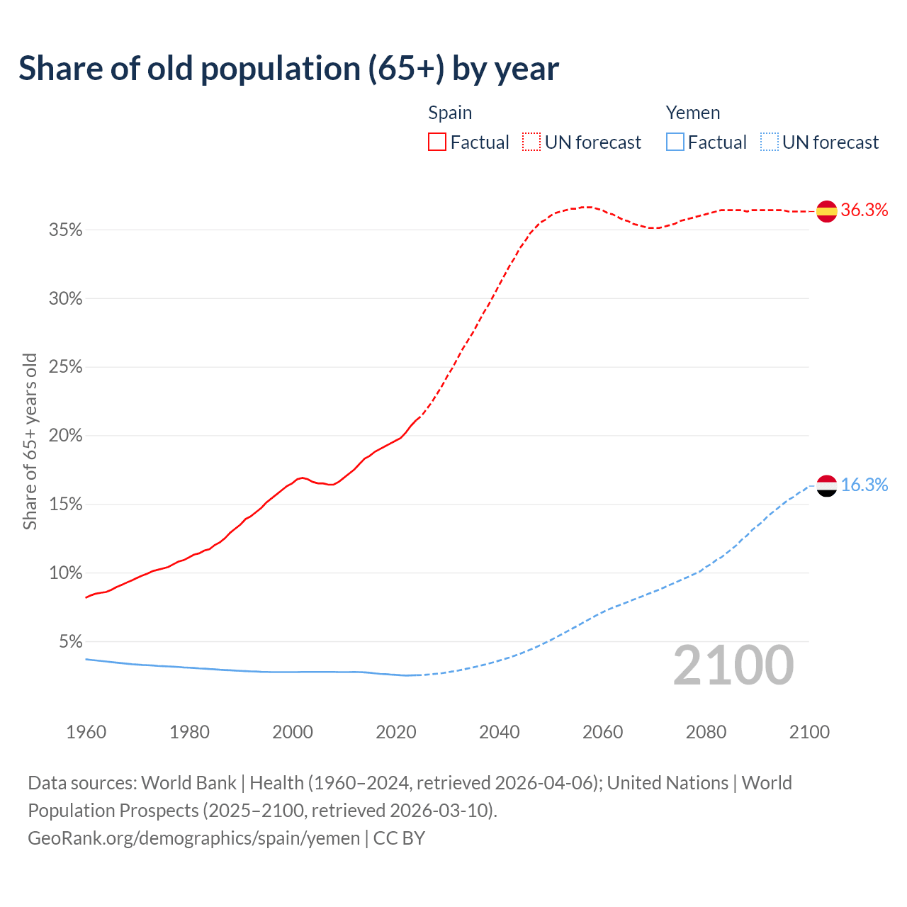 The share of older people aged 65 and over is 21.1% in Spain and 2.52% in Yemen. Life expectancy in Spain compared to Yemen .
