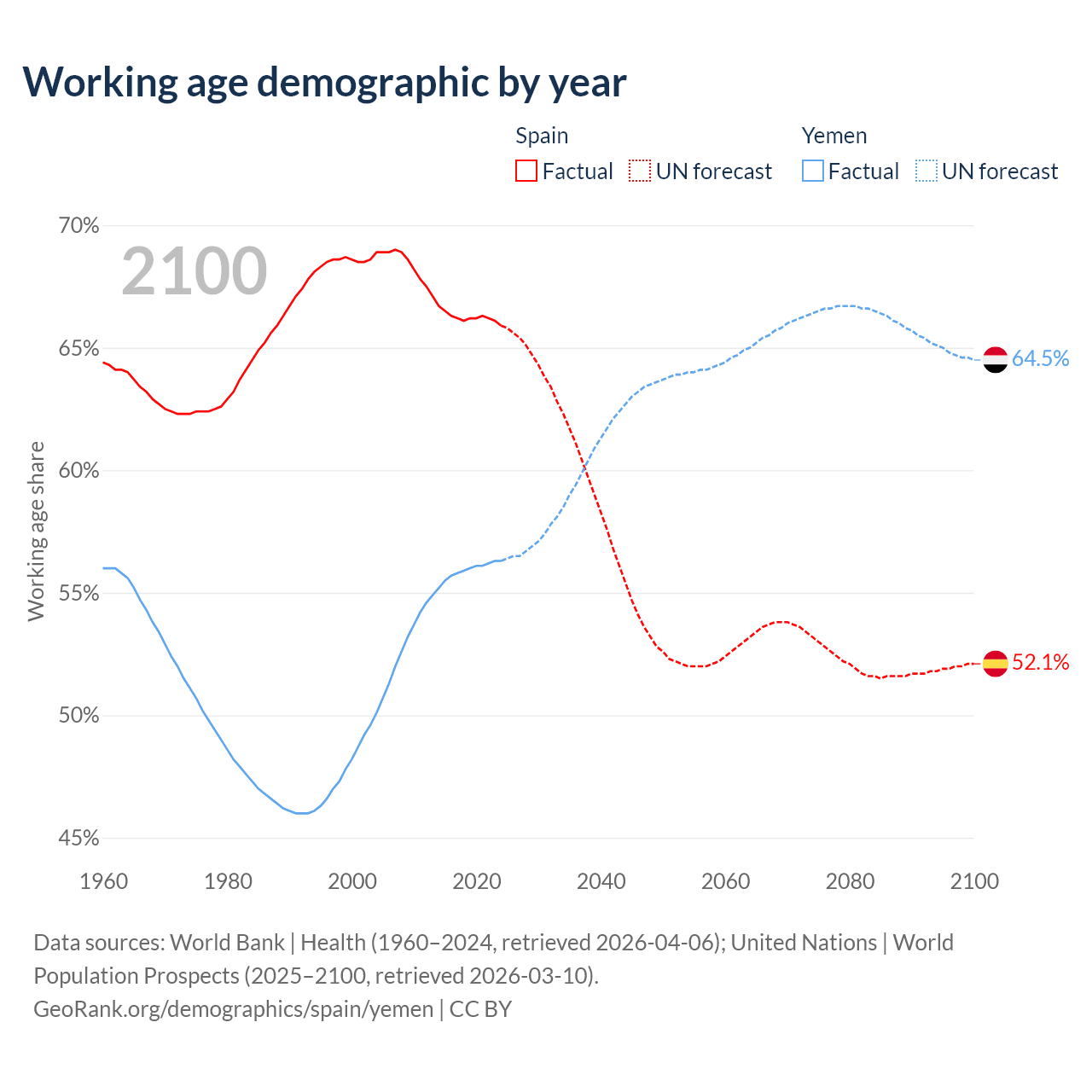- Spain has 32.2M working age adults (aged 15-64) vs 24.4M in Yemen.