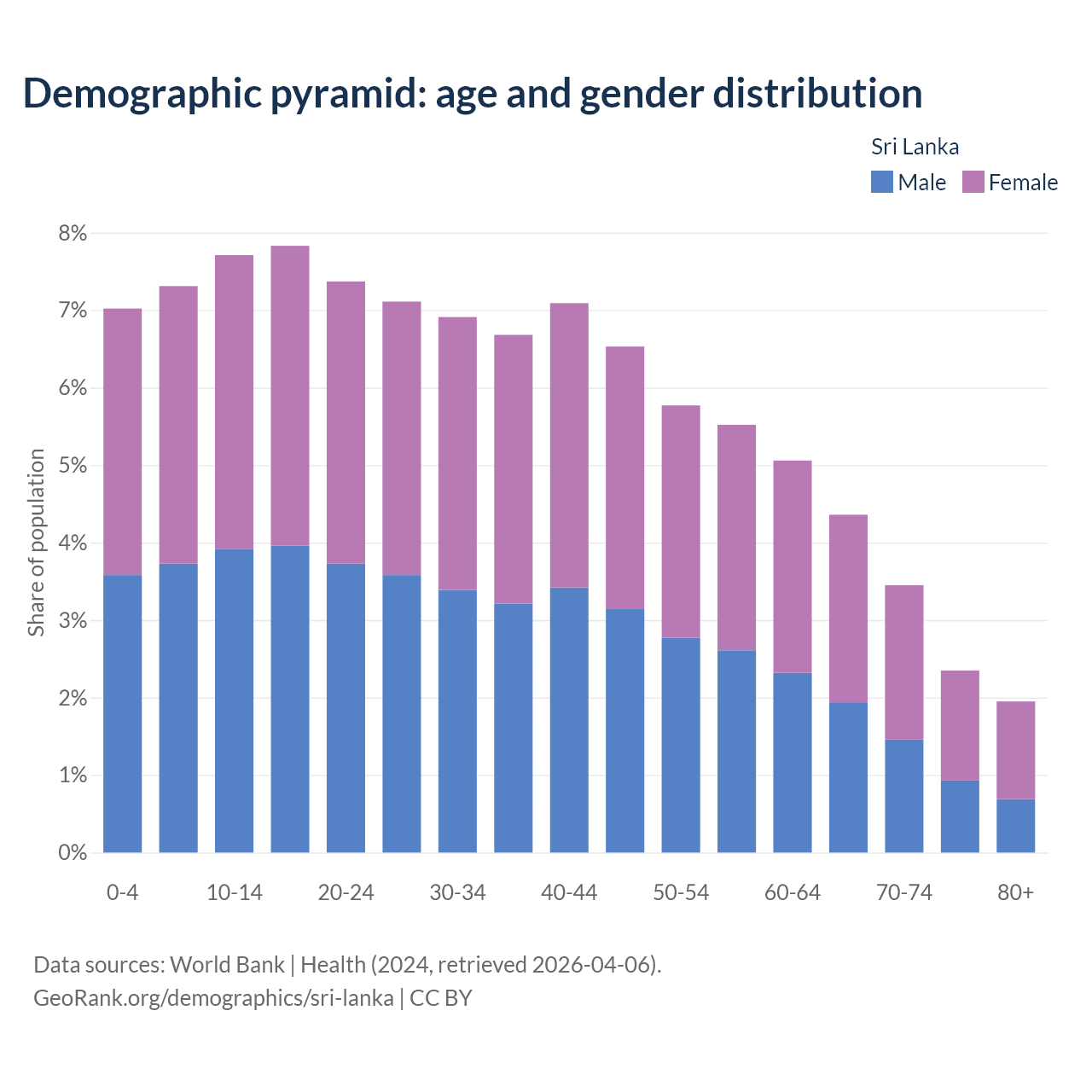 With a population of 21.9M people, Sri Lanka has a median age of 34.1 years which makes it the 81/196 oldest country. 22% of the demographic are children 0-14 years old, 65.9% are working-age people aged 15-64, and 12.1% are older population aged 65+ years.
