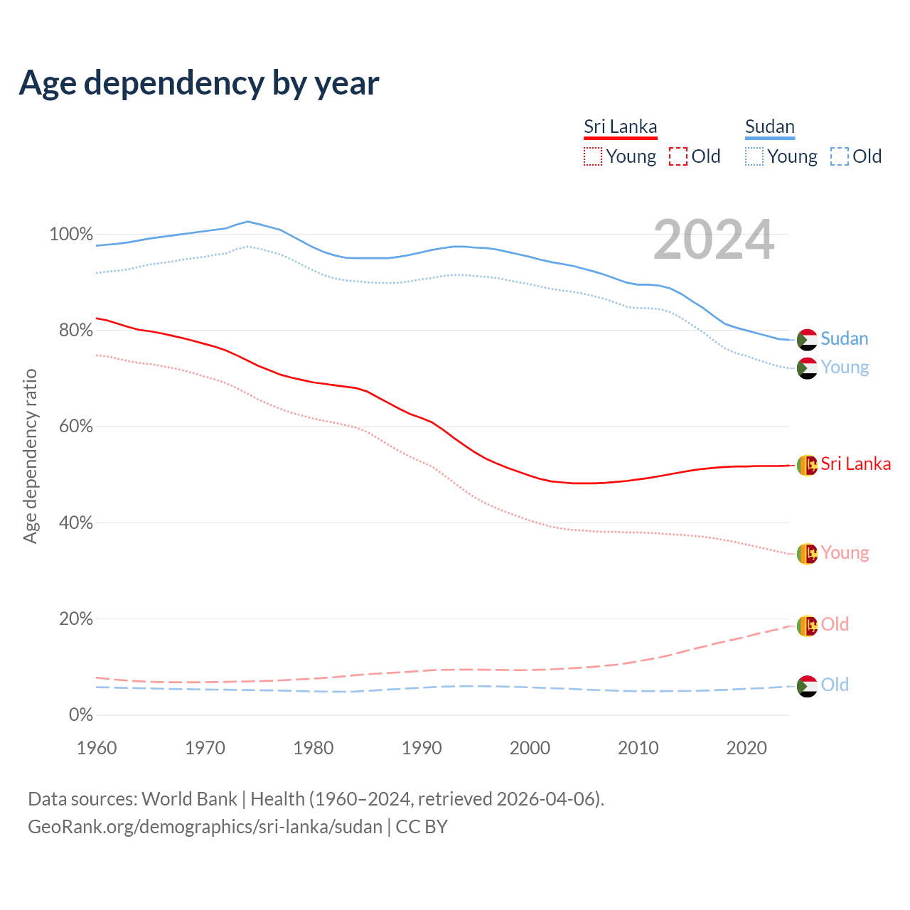 - Sri Lanka is ranked 81/196 by median age (oldest to youngest) vs 172/196 for Sudan.