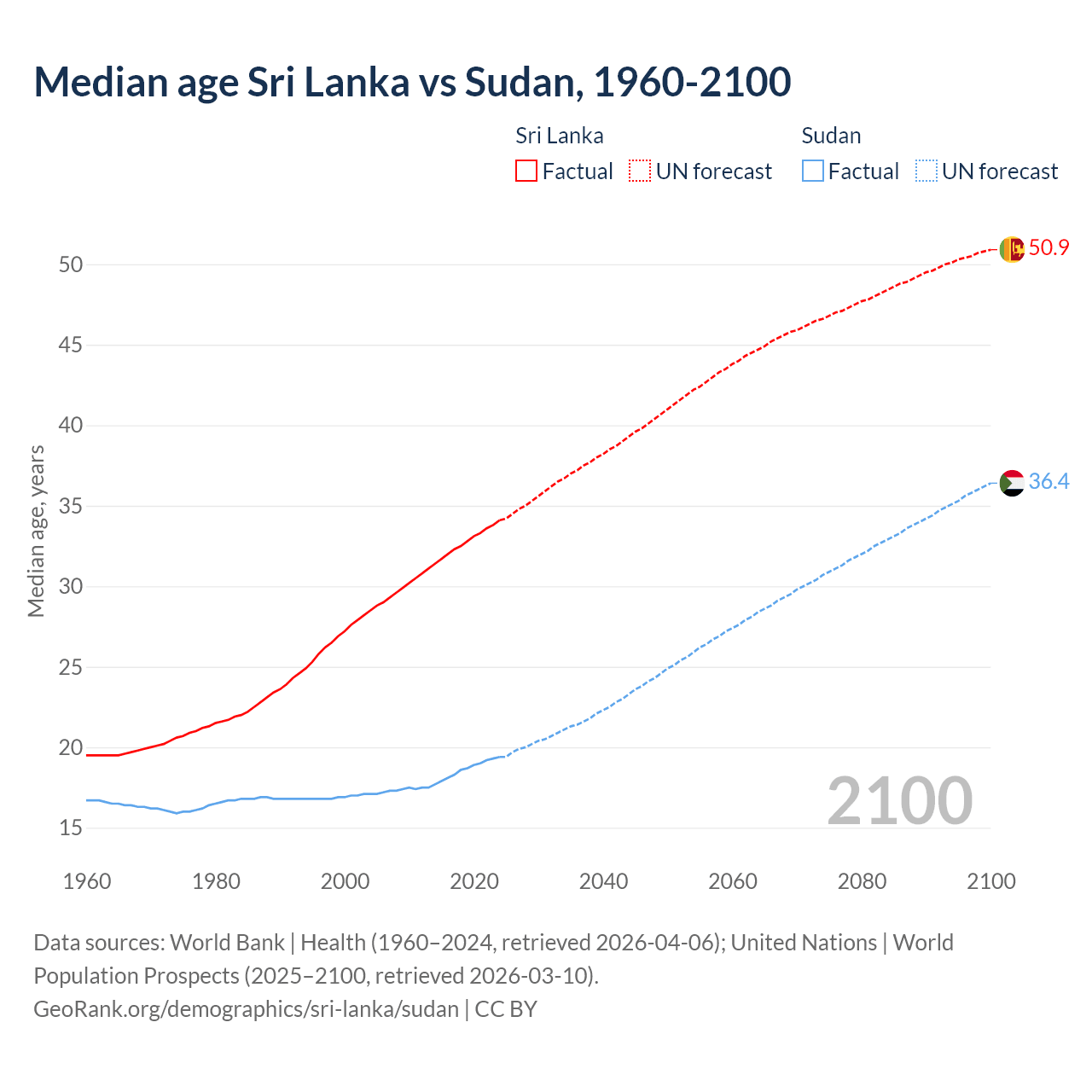 Median age Sri Lanka vs Sudan, 1960-2100
