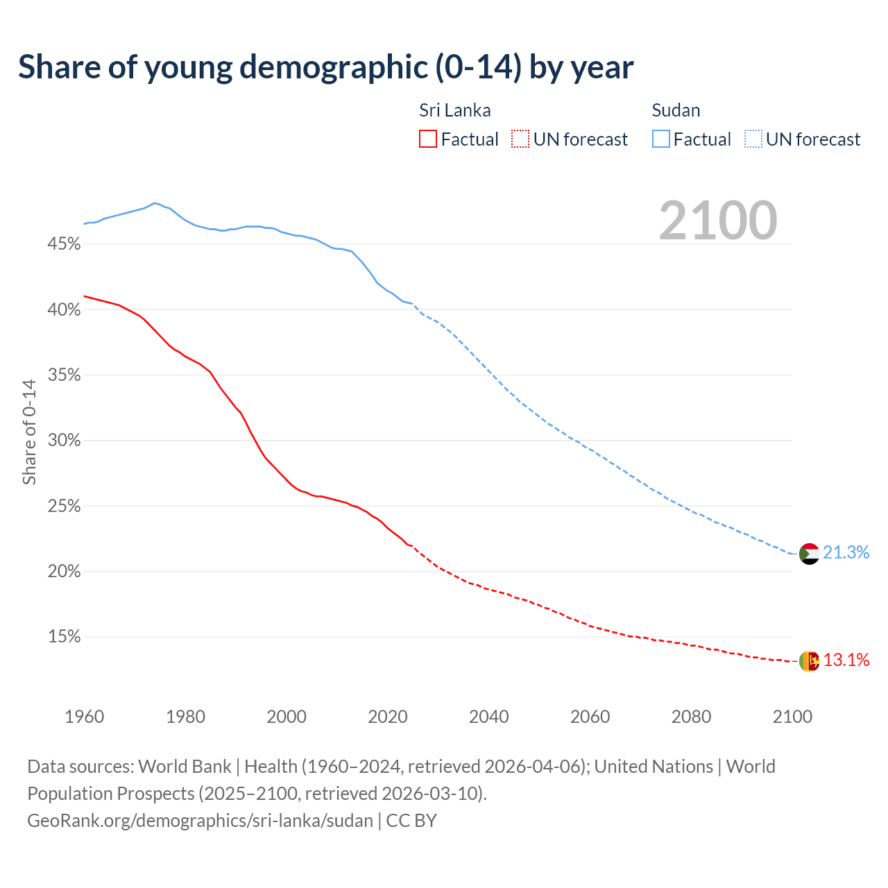 - The share of young demographic (0-15 years old) in Sri Lanka is 22% vs 40.5% in Sudan.