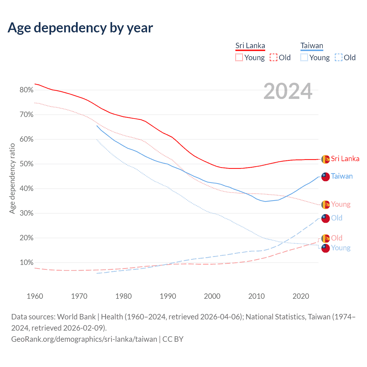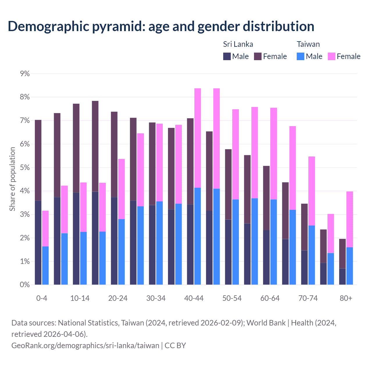 - Sri Lanka is ranked 81/196 by median age (oldest to youngest) vs 16/196 for Taiwan.