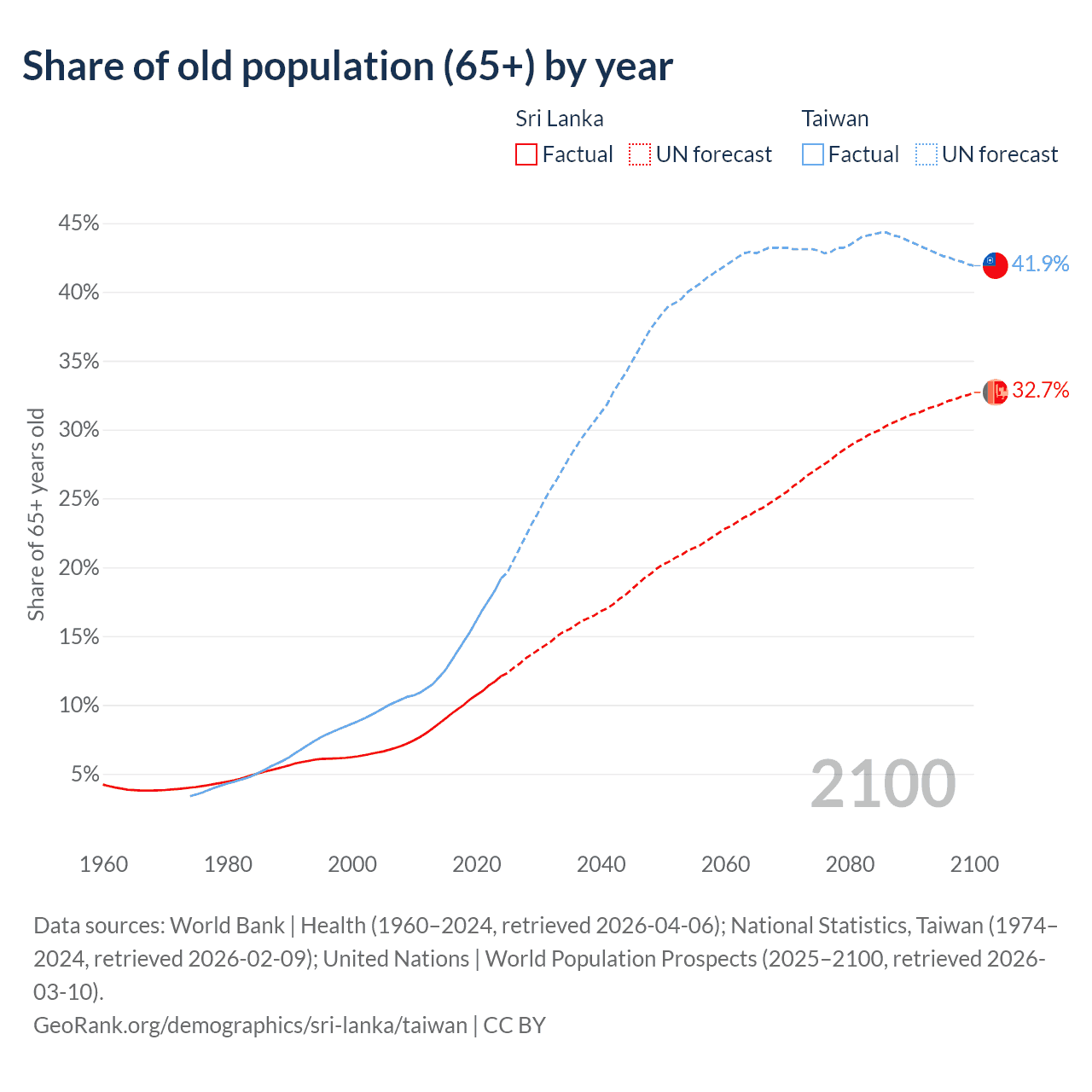 The share of older people aged 65 and over is 12.1% in Sri Lanka and 19.2% in Taiwan. Life expectancy in Sri Lanka compared to Taiwan .