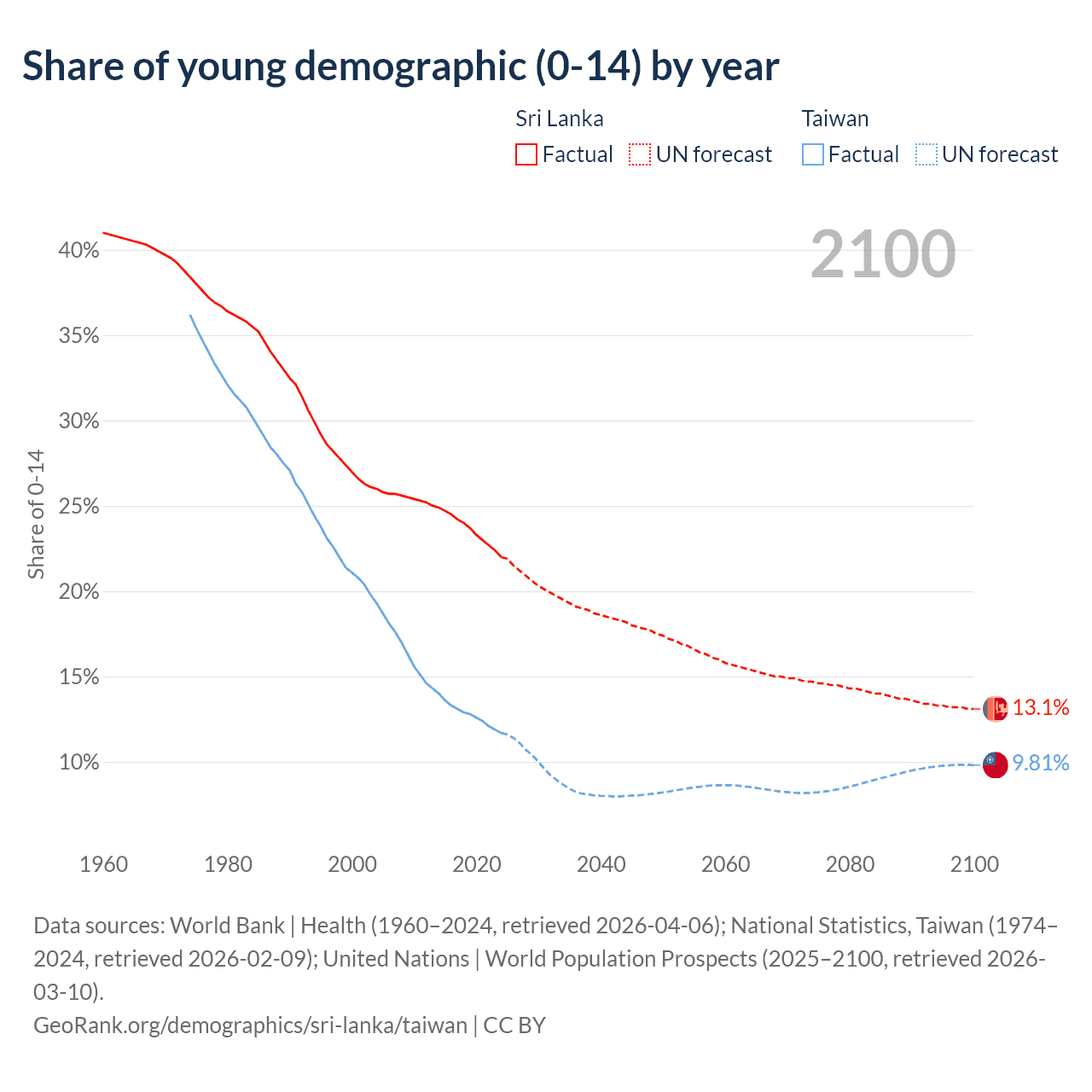 - The share of young demographic (0-15 years old) in Sri Lanka is 22% vs 11.7% in Taiwan.
