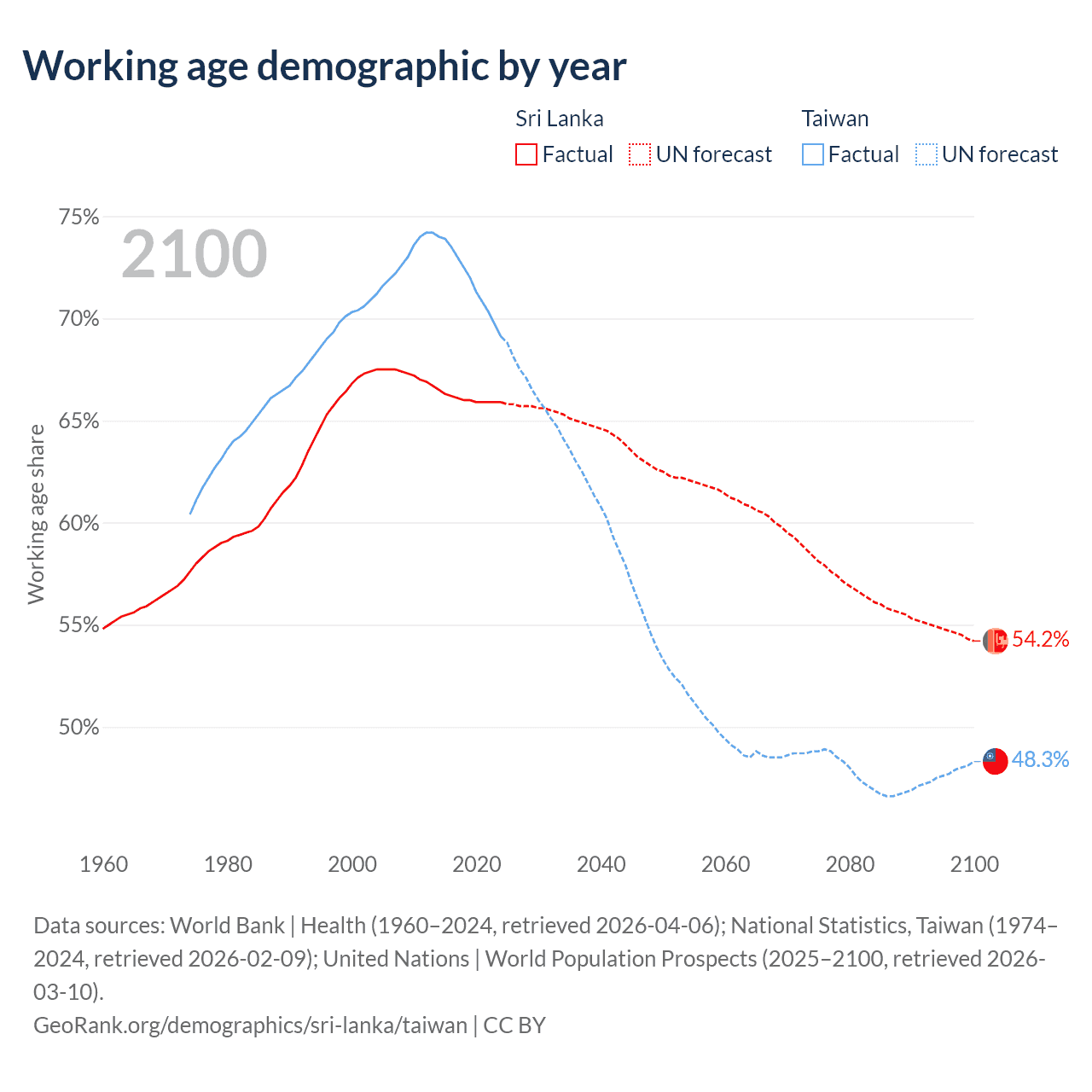 - Sri Lanka has 14.6M working age adults (aged 15-64) vs 16.1M in Taiwan.