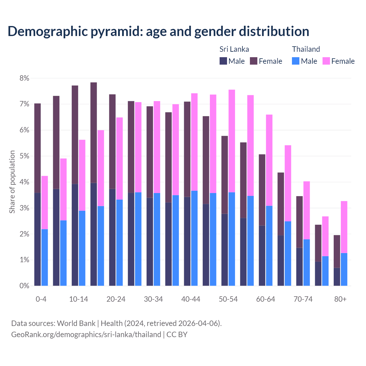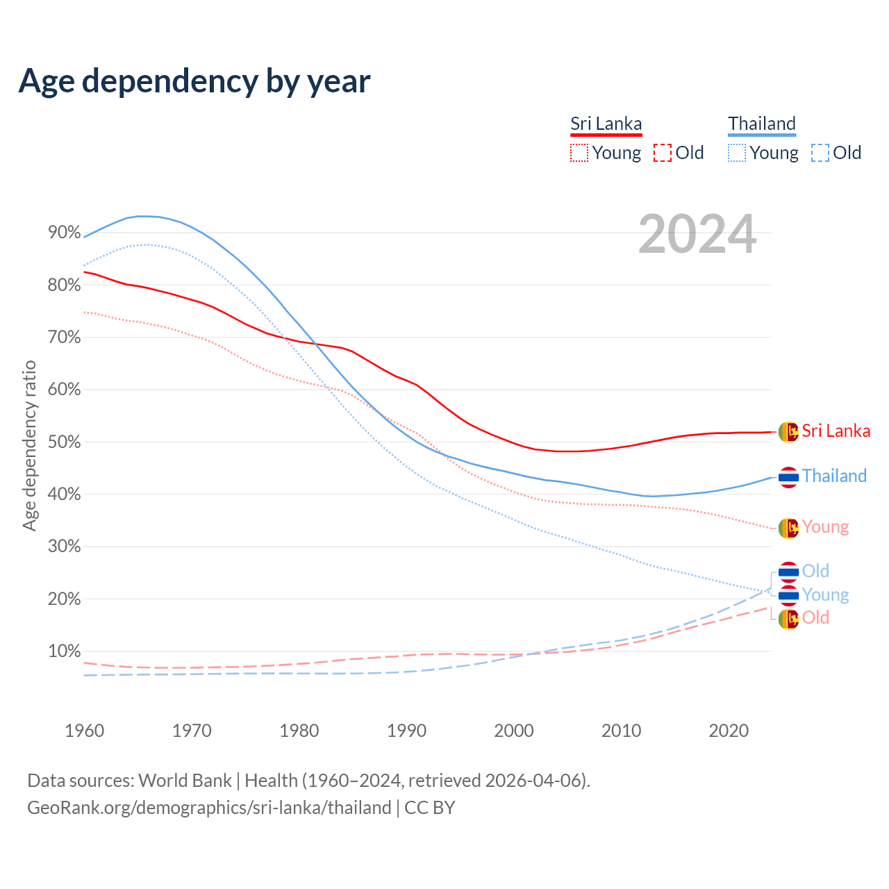 - Sri Lanka is ranked 81/196 by median age (oldest to youngest) vs 40/196 for Thailand.