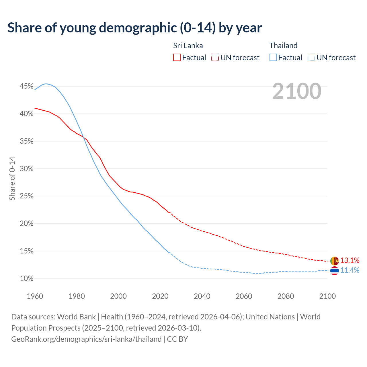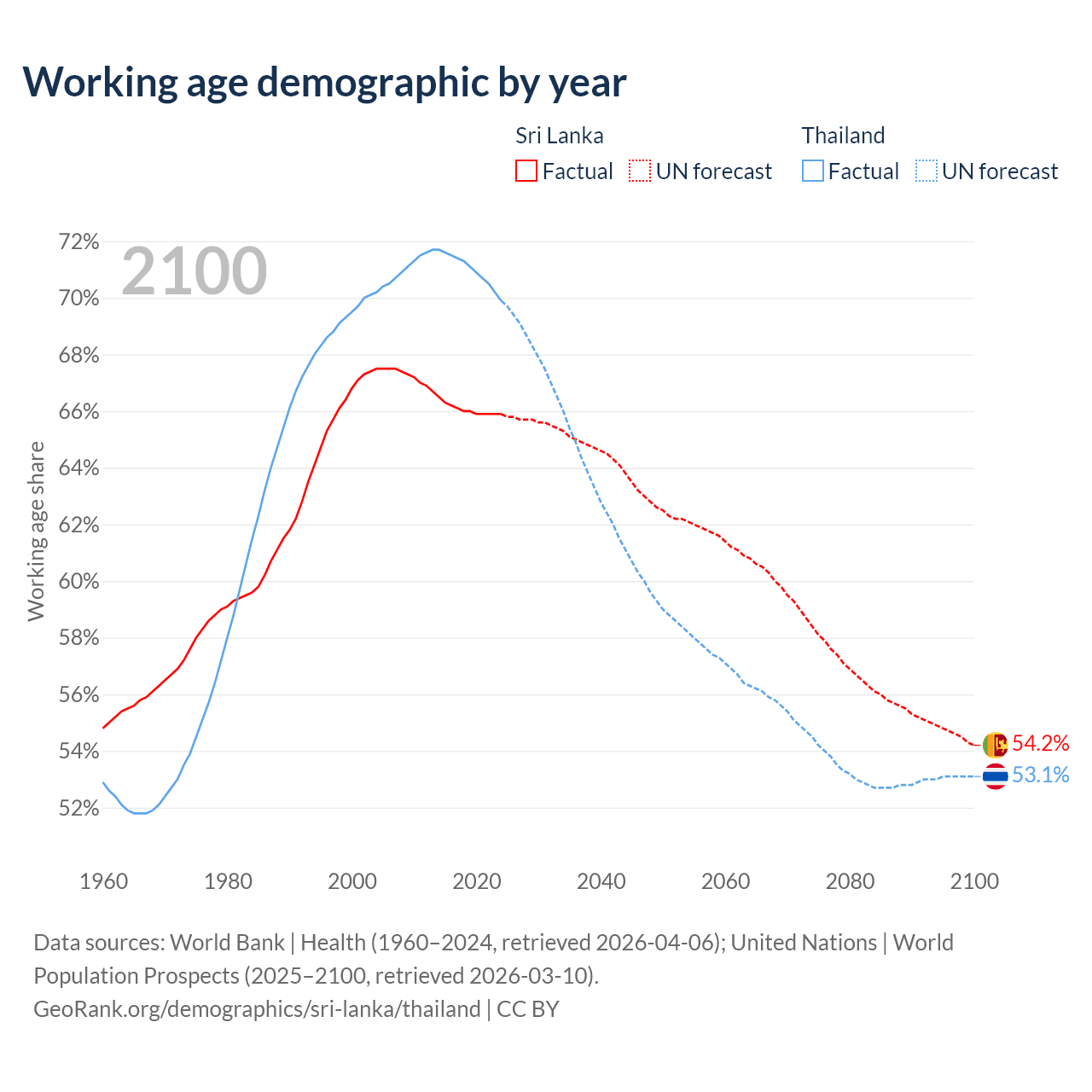Median age Sri Lanka vs Thailand, 1960-2100