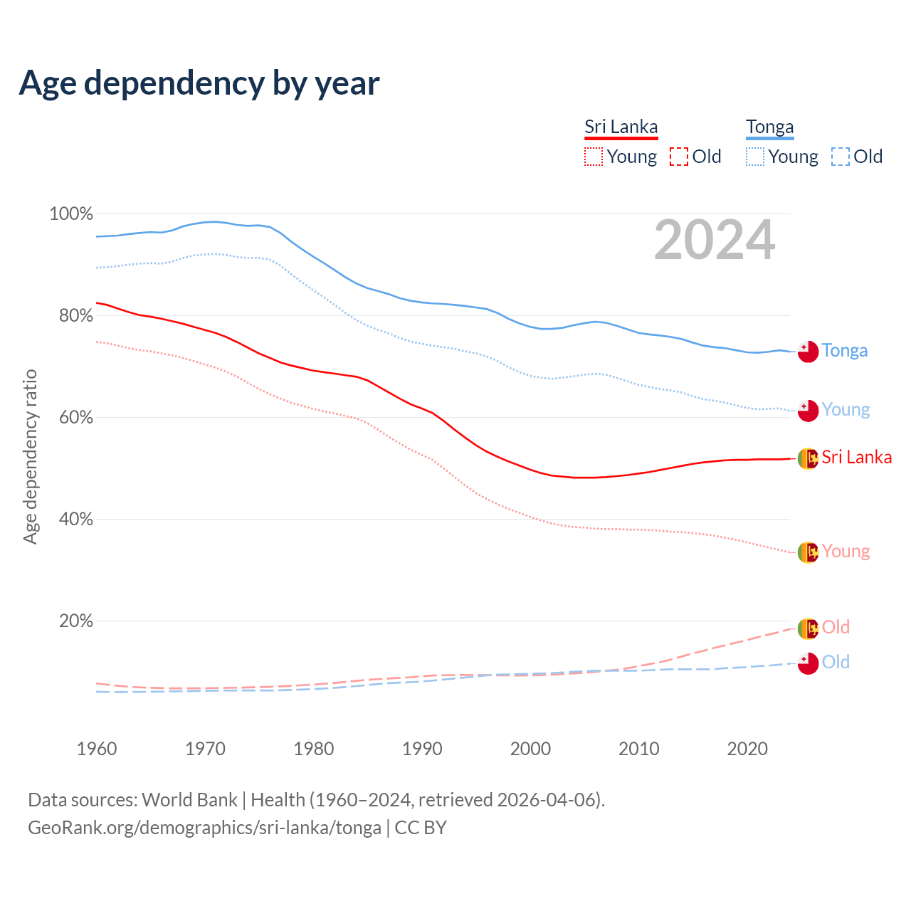 - Sri Lanka is ranked 81/196 by median age (oldest to youngest) vs 149/196 for Tonga.