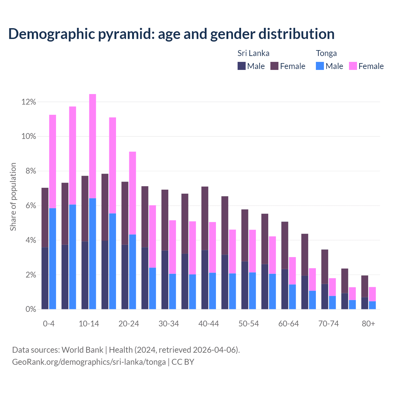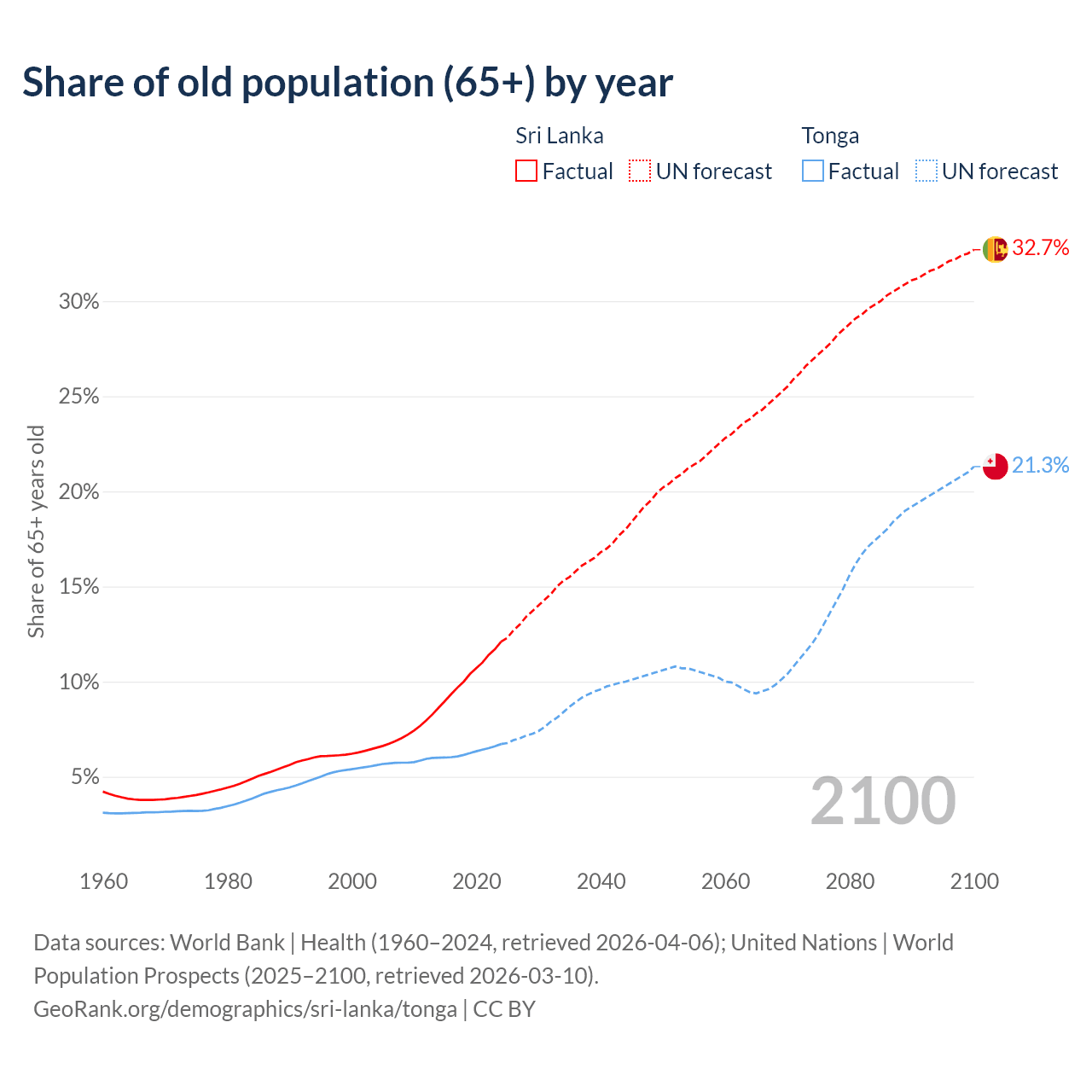 The share of older people aged 65 and over is 12.1% in Sri Lanka and 6.72% in Tonga. Life expectancy in Sri Lanka compared to Tonga .