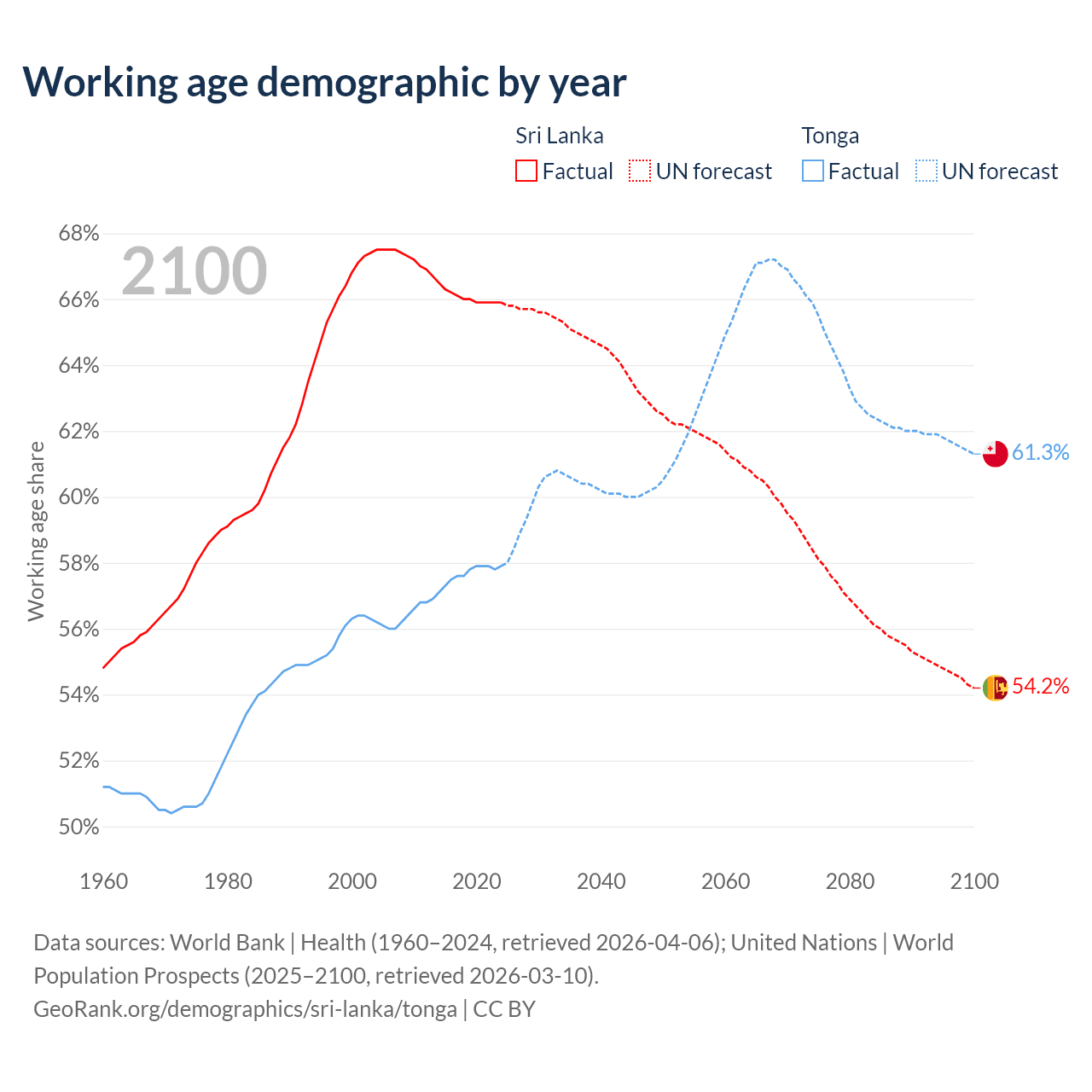 - Sri Lanka has 14.6M working age adults (aged 15-64) vs 59.8K in Tonga.