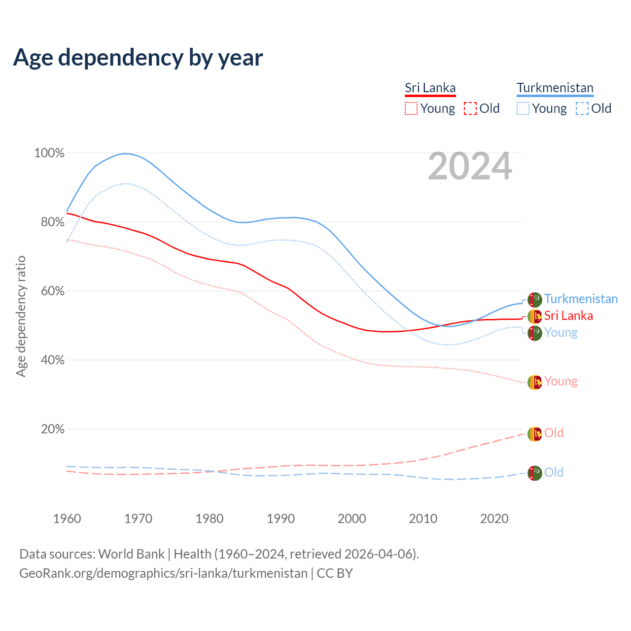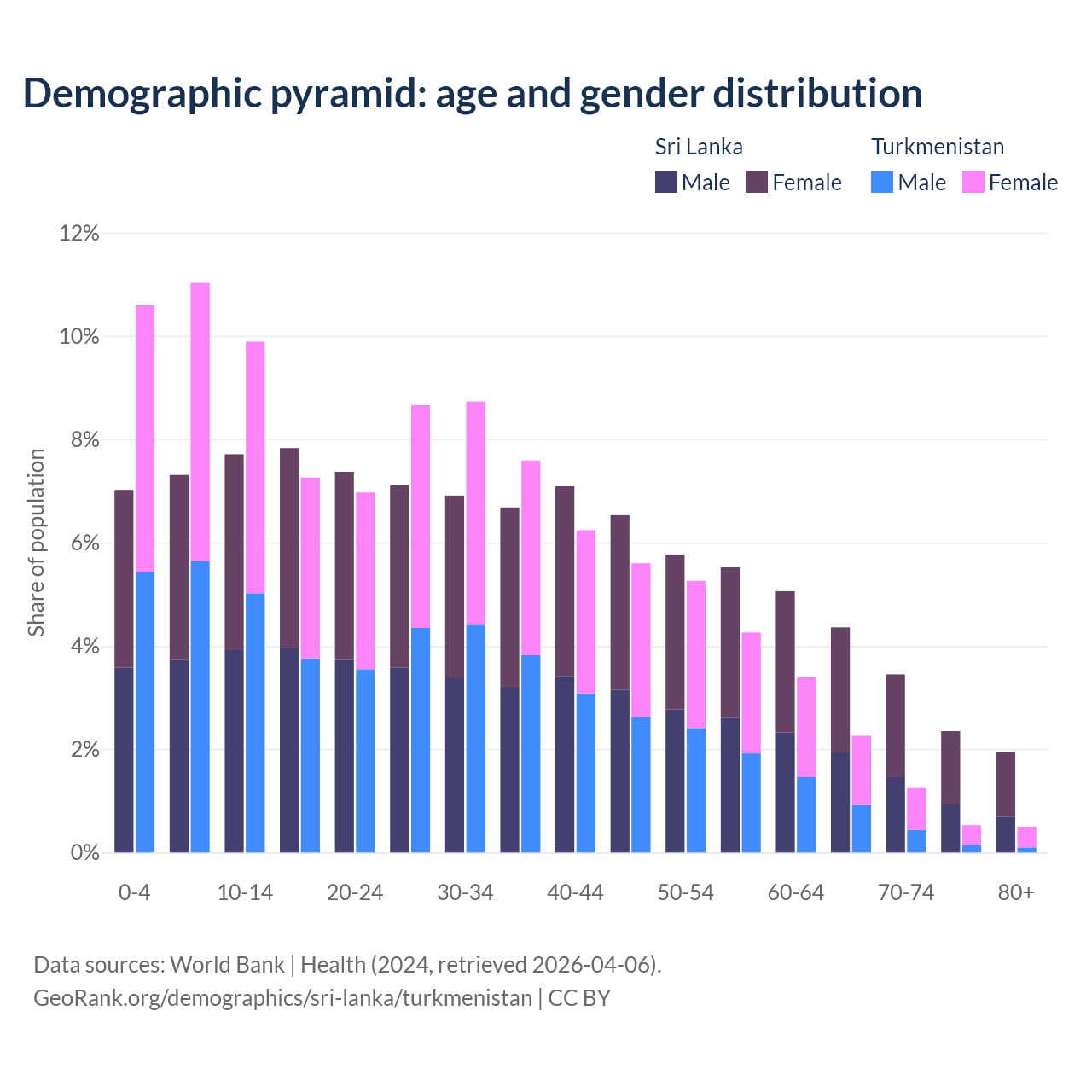 - Sri Lanka is ranked 81/196 by median age (oldest to youngest) vs 119/196 for Turkmenistan.
