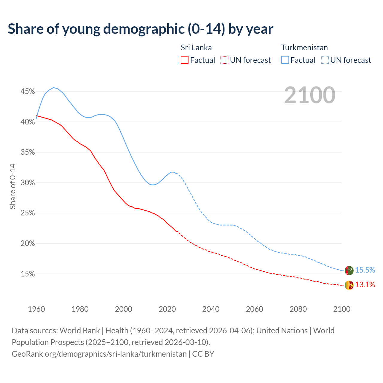 - As of 2026, the population of Sri Lanka is 22.2M vs 7.78M in Turkmenistan - 2.85 times difference.