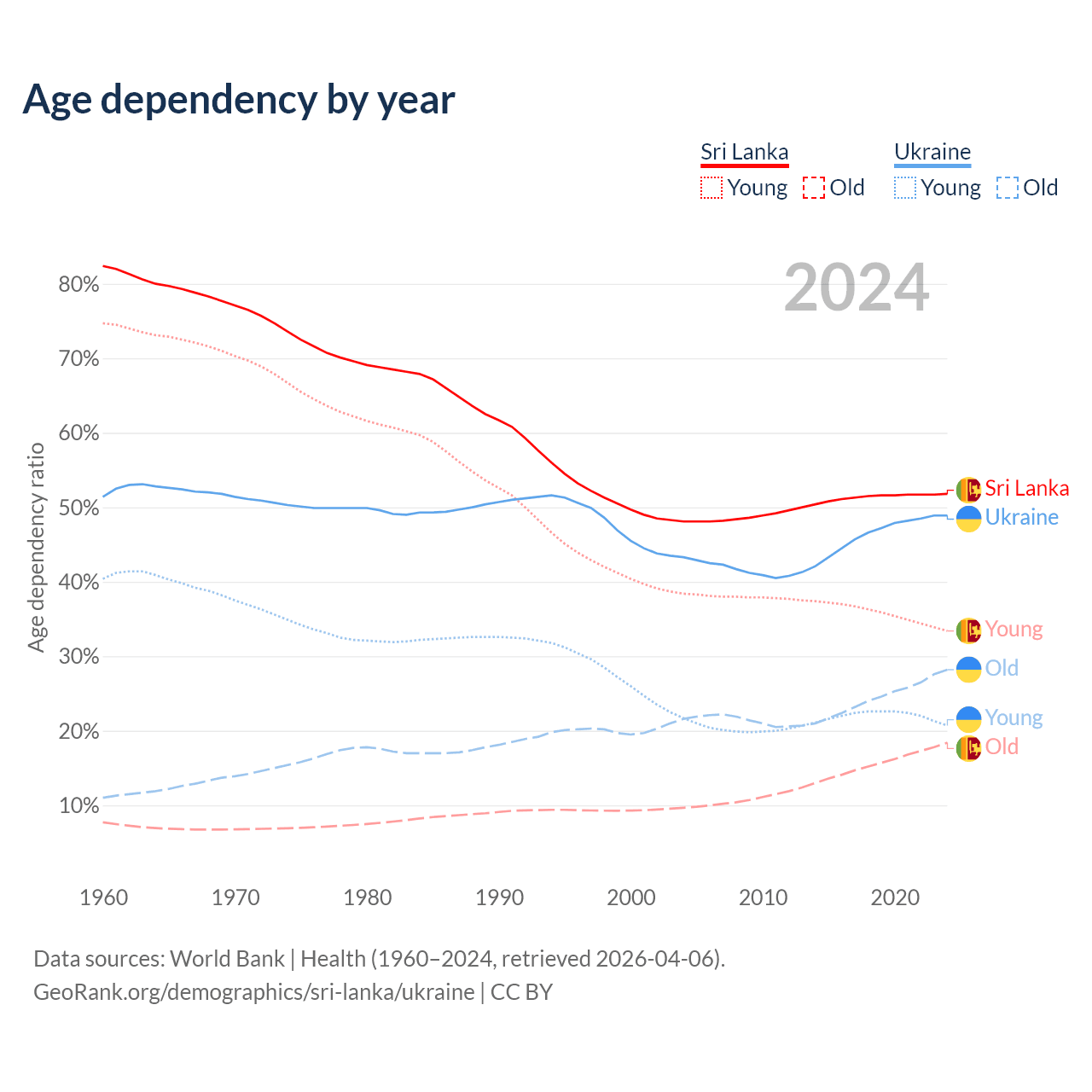 - Sri Lanka is ranked 81/196 by median age (oldest to youngest) vs 26/196 for Ukraine.
