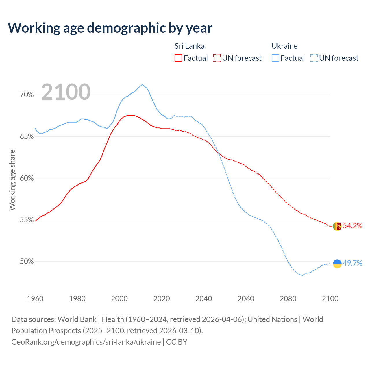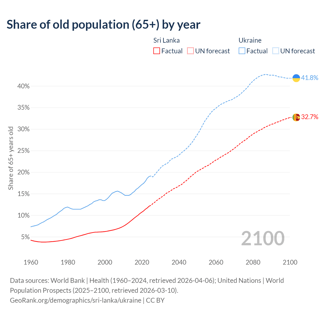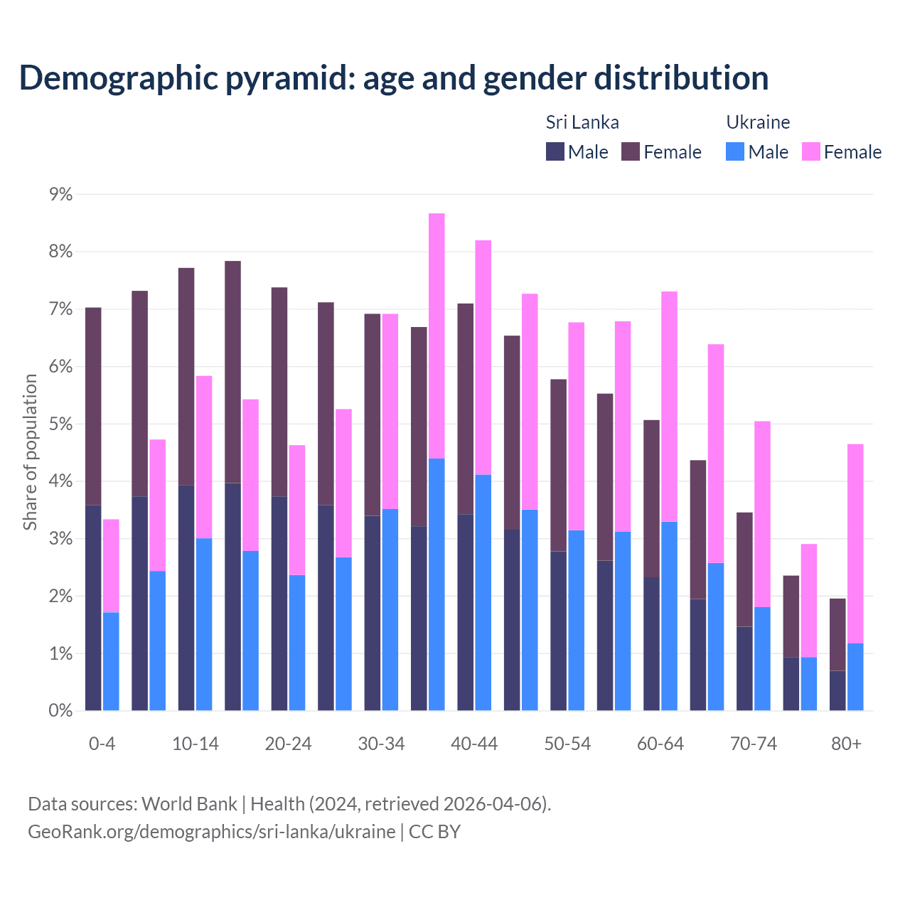 The share of older people aged 65 and over is 12.1% in Sri Lanka and 19% in Ukraine. Life expectancy in Sri Lanka compared to Ukraine .